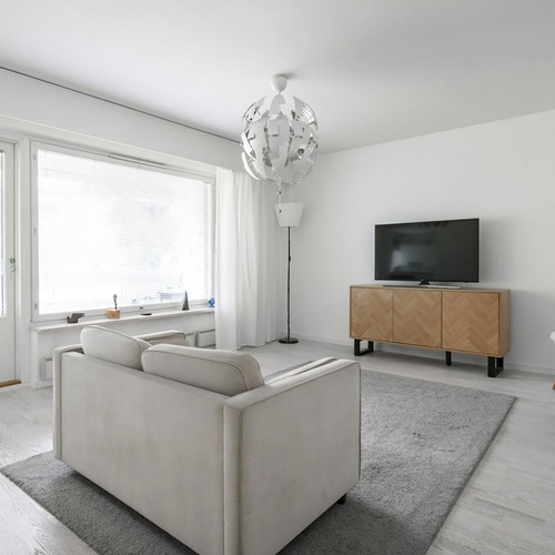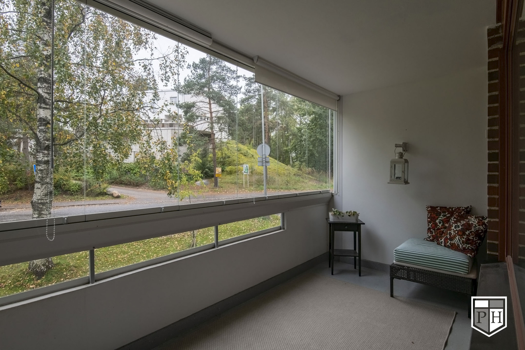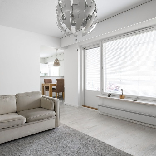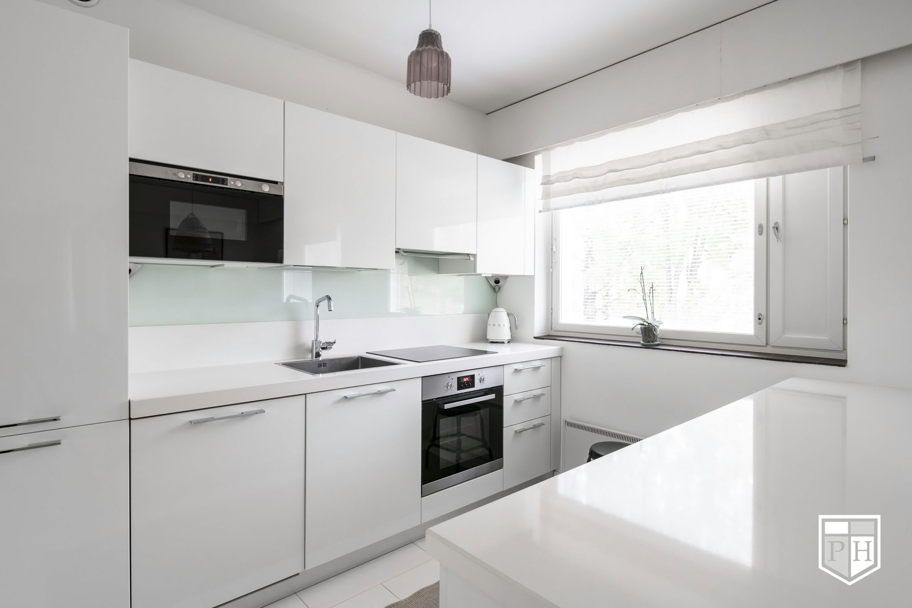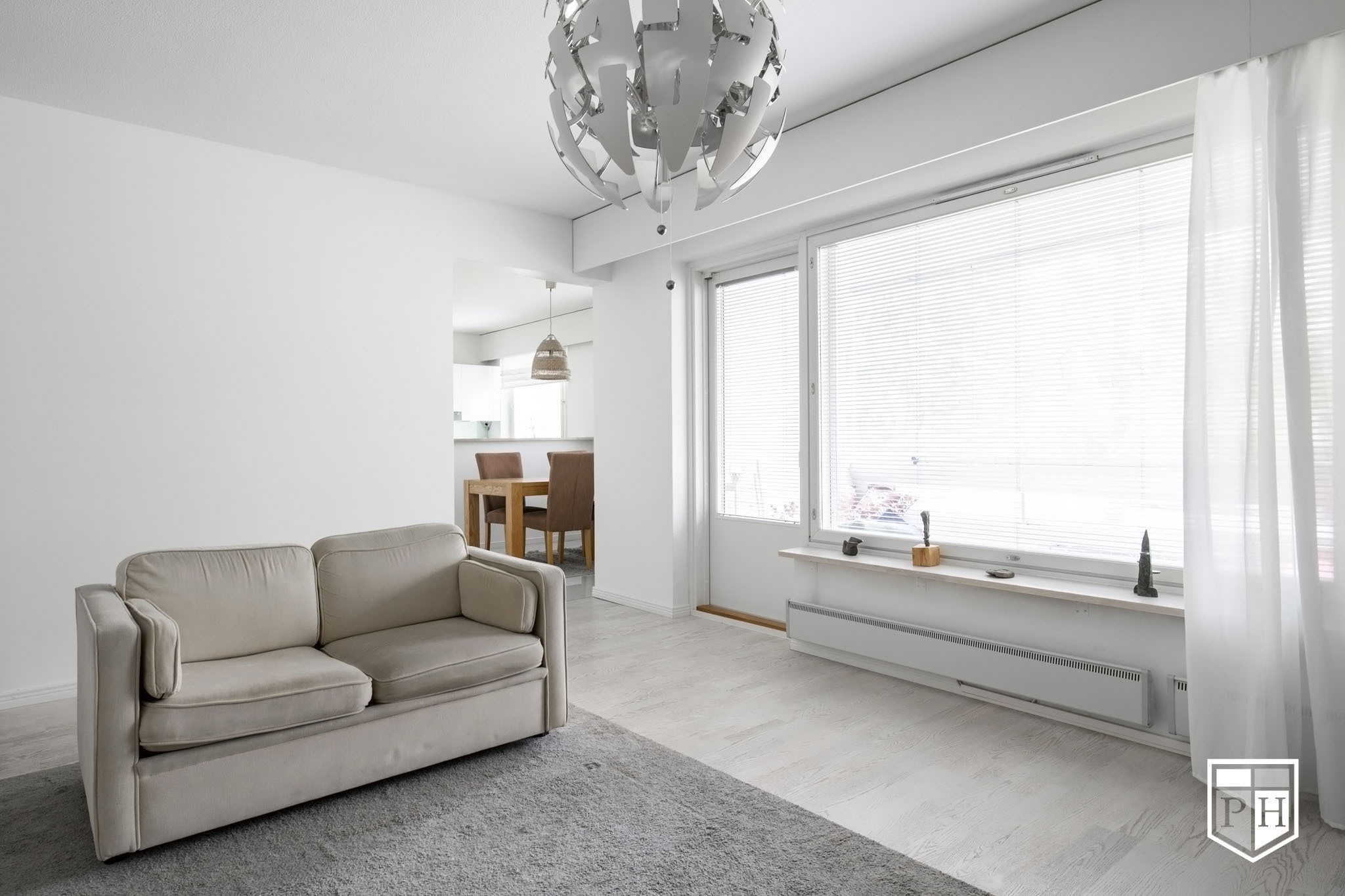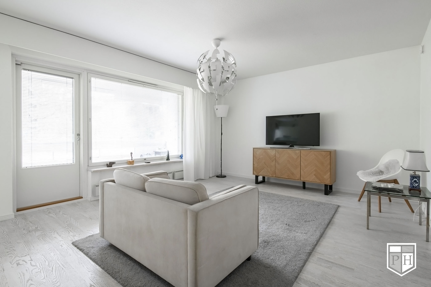 Avara ja valoisa ensimmäisen kerroksen muuttovalmis kolmio. Valoa tulvii isoista etelänpuolisen ikkunoista niin olohuoneeseen, keittiöön kuin ruokailutilaankin. Olohuoneessa on takkavaraus ja käynti isolle parvekkeelle. Valkoinen keittiö on moderni ja tehokas, paljon lasku- ja kaappitilaa. Pohjoisen puolella on kaksi mukavan kokoista makuuhuonetta. Pohjaratkaisu on toimiva, jo eteistilaan astuessa tuntee tulevansa avaraan huoneistoon. Putkiremontin yhteydessä uudistetut saniteettitilat, kodinhoitohuone ja tilava vaatehuone käytännöllisesti heti eteistilan vierellä. Huoneiston materiaalit ja tyyli on kauttaaltaan vaaleaa, ajatonta ja tyylikästä.