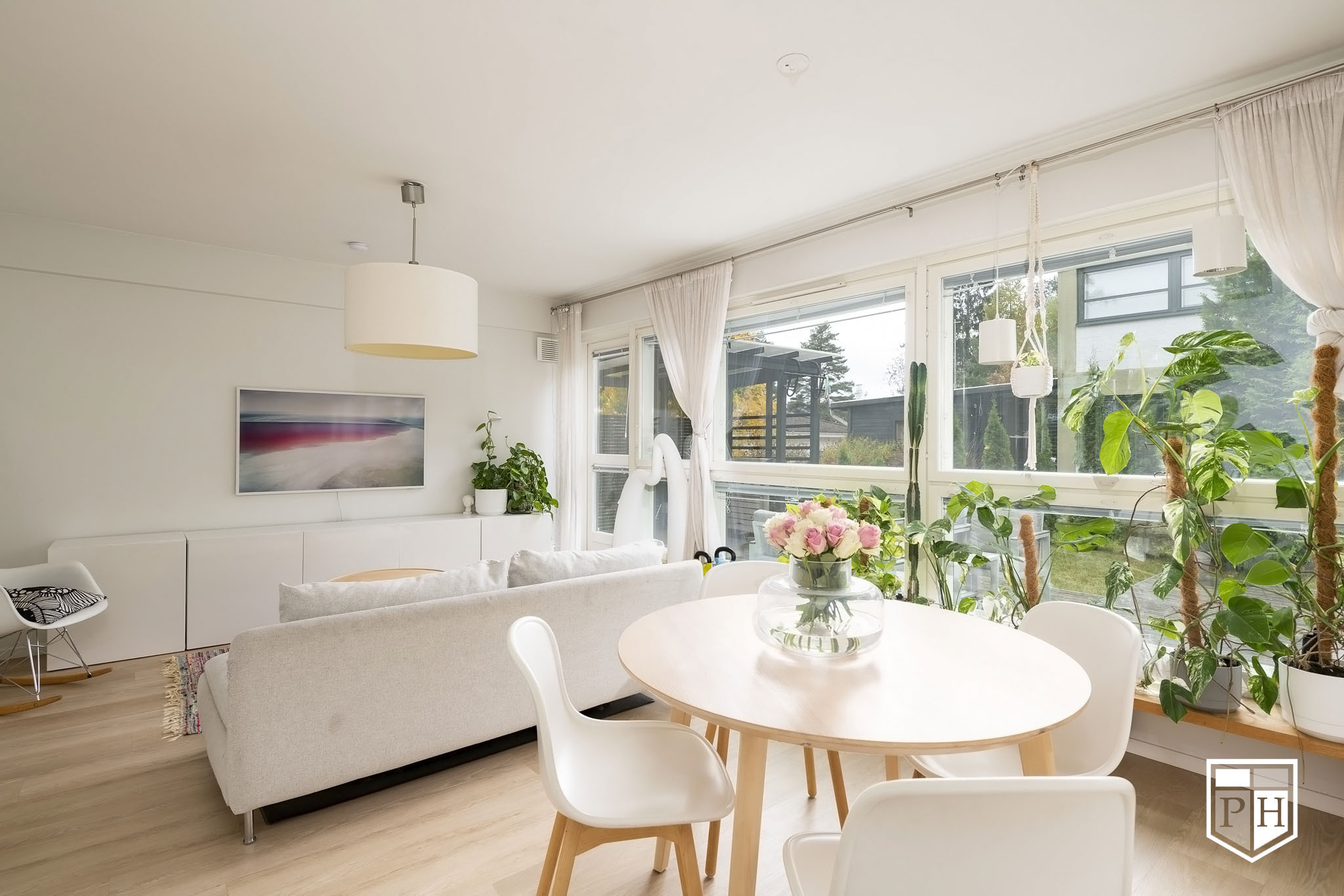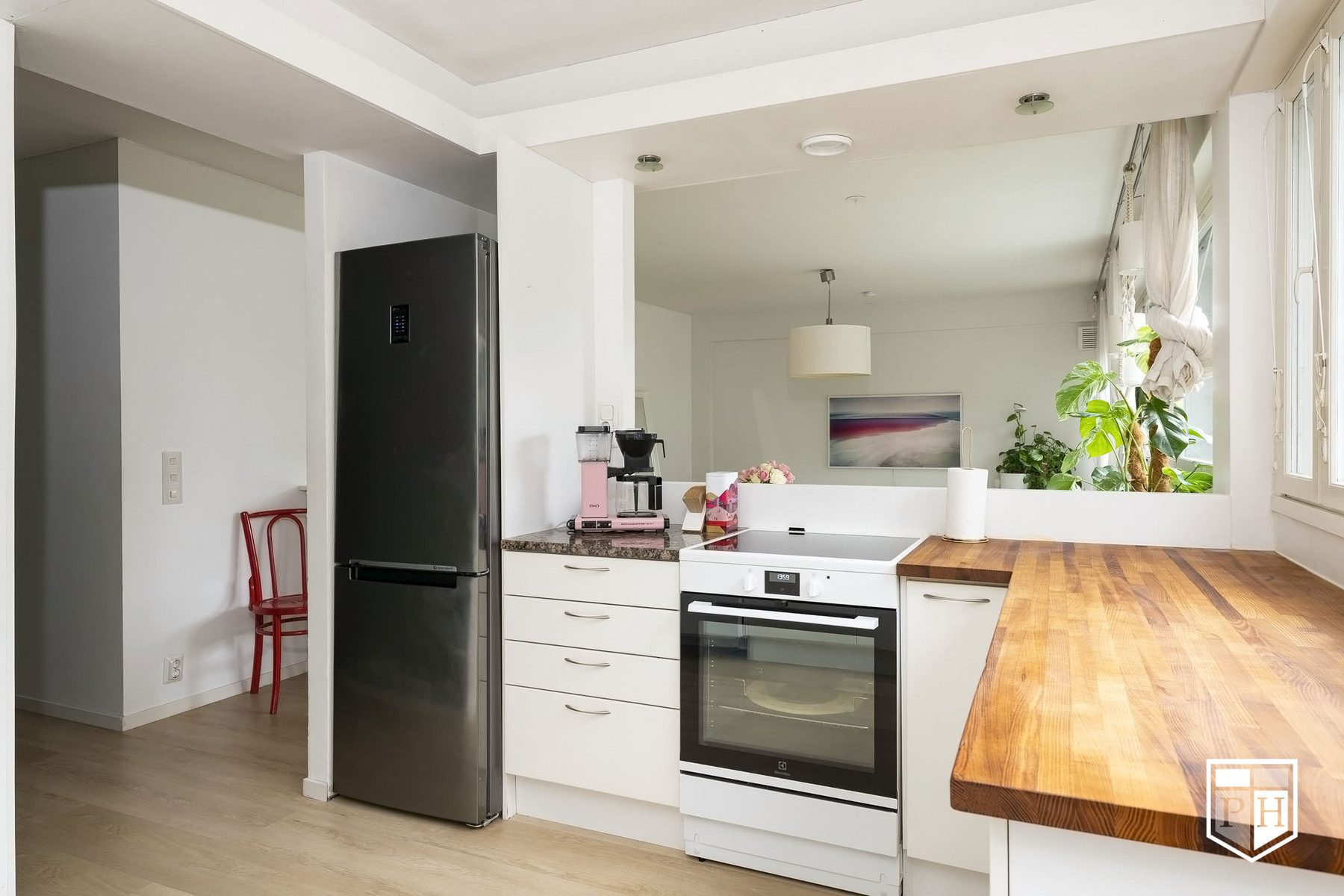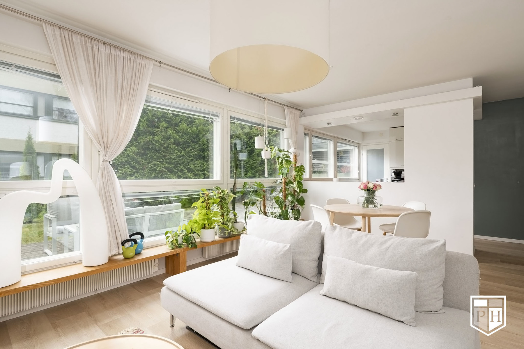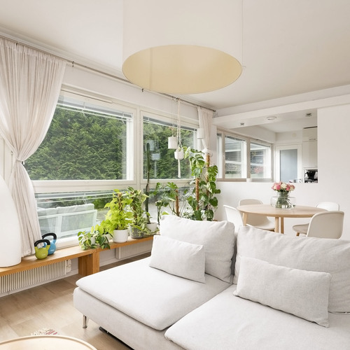Avaran olohuoneen ja keittiön muodostama yhtenäinen tila tarjoaa valoisan ja toimivan sydämen kodille. 1970-luvun arkkitehtuurille tyypilliset suuret ikkunat tuovat luonnonvalon kauniisti sisään ja luovat ilmavan tunnelman.