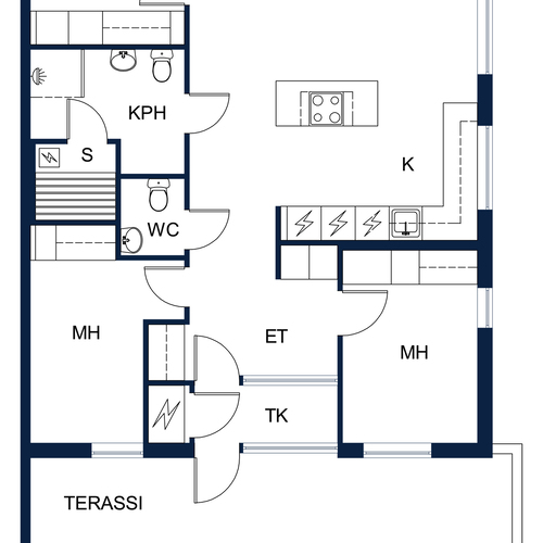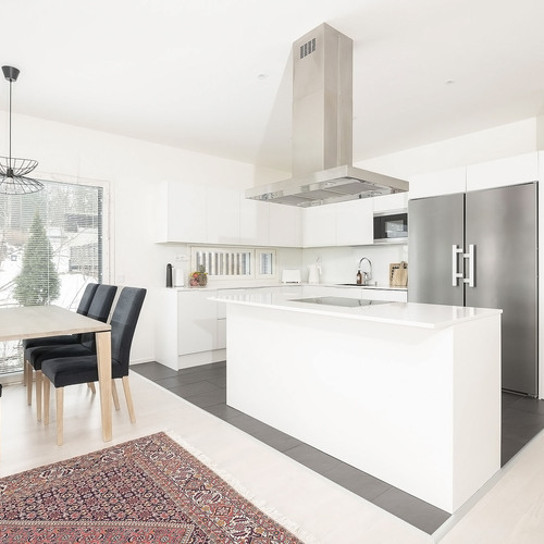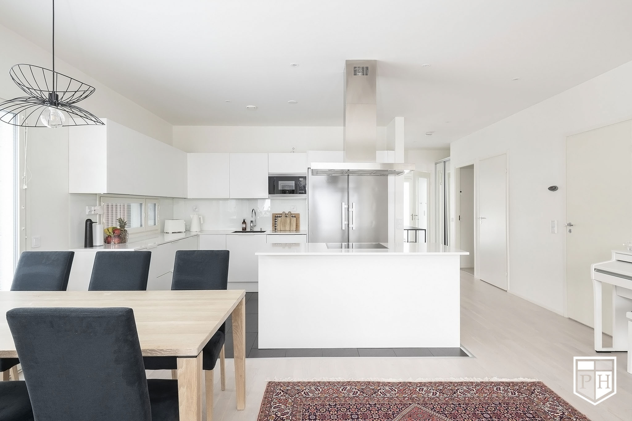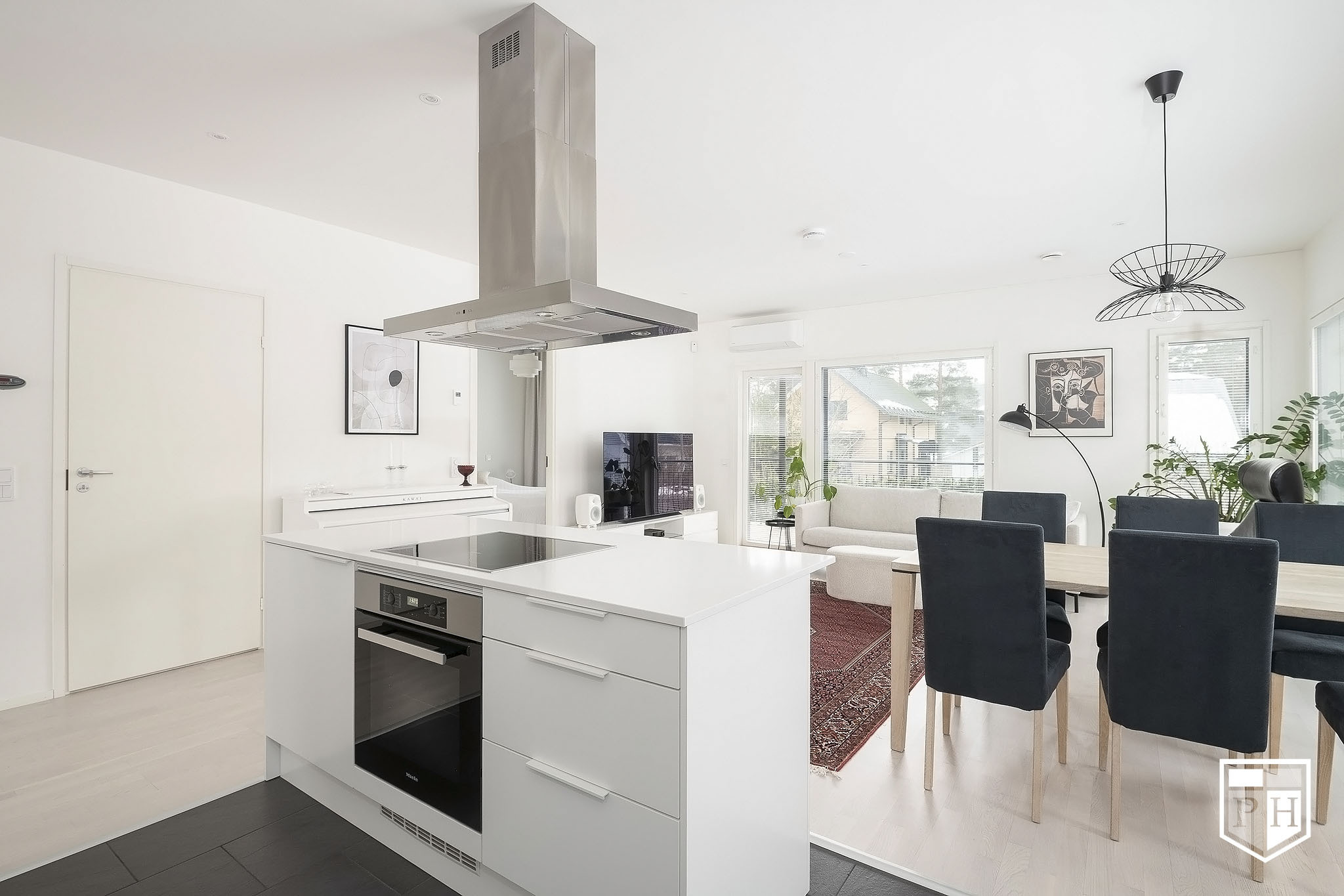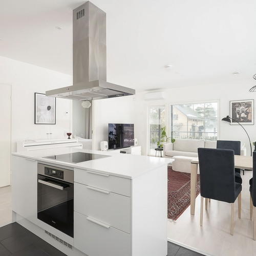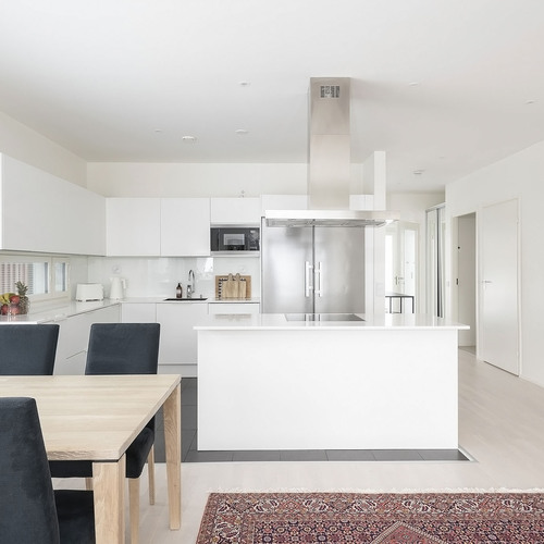 A la Carte -keittiö. Kivitasot. Mielen jääkaappi ja pakastin, erillisuuni, induktioliesitaso, integroitu astianpesukone. Electroluxin mikroaaltouuni. Elican liesituuletin. Lattia laattaa.