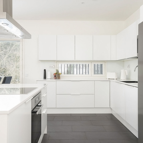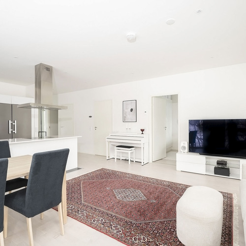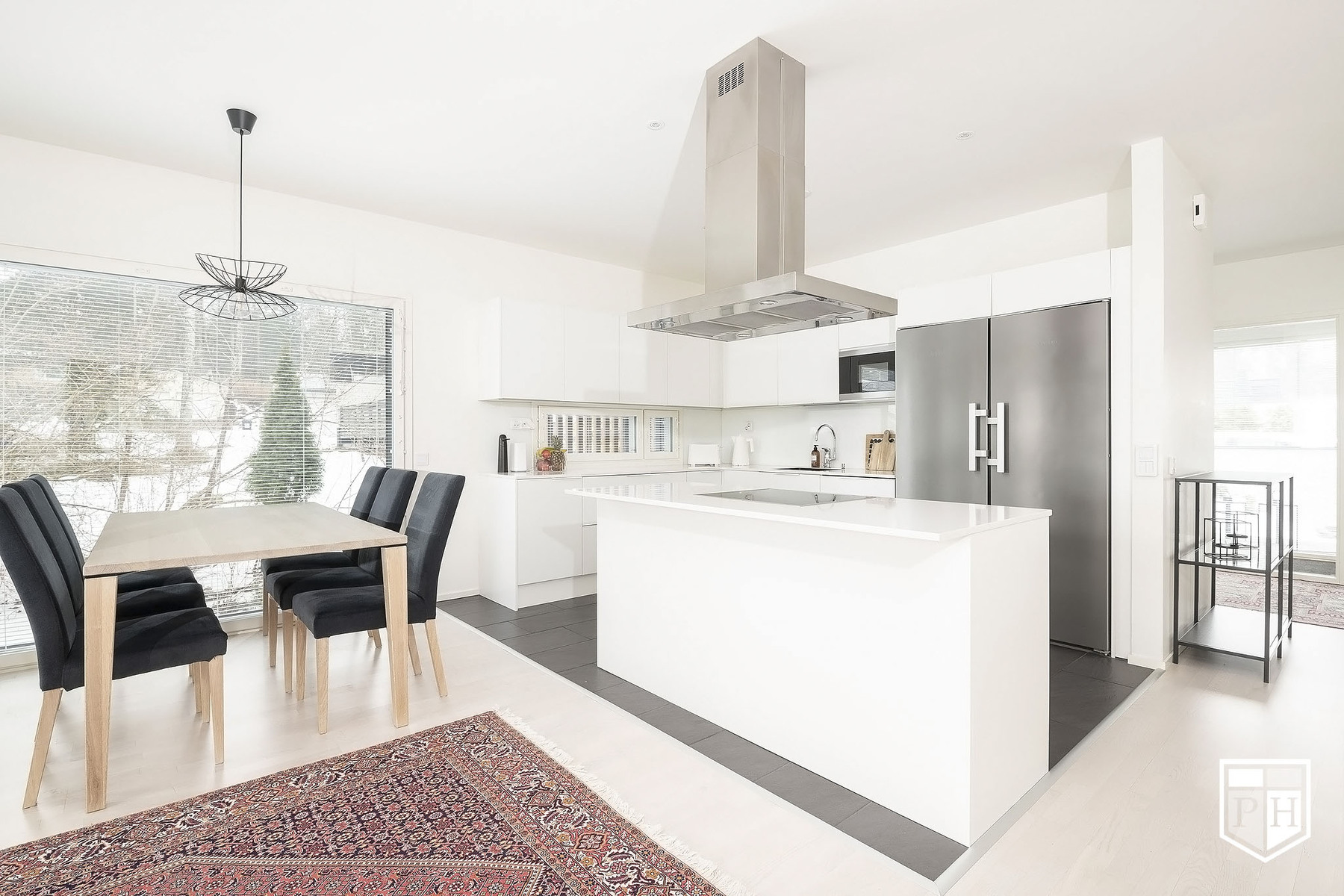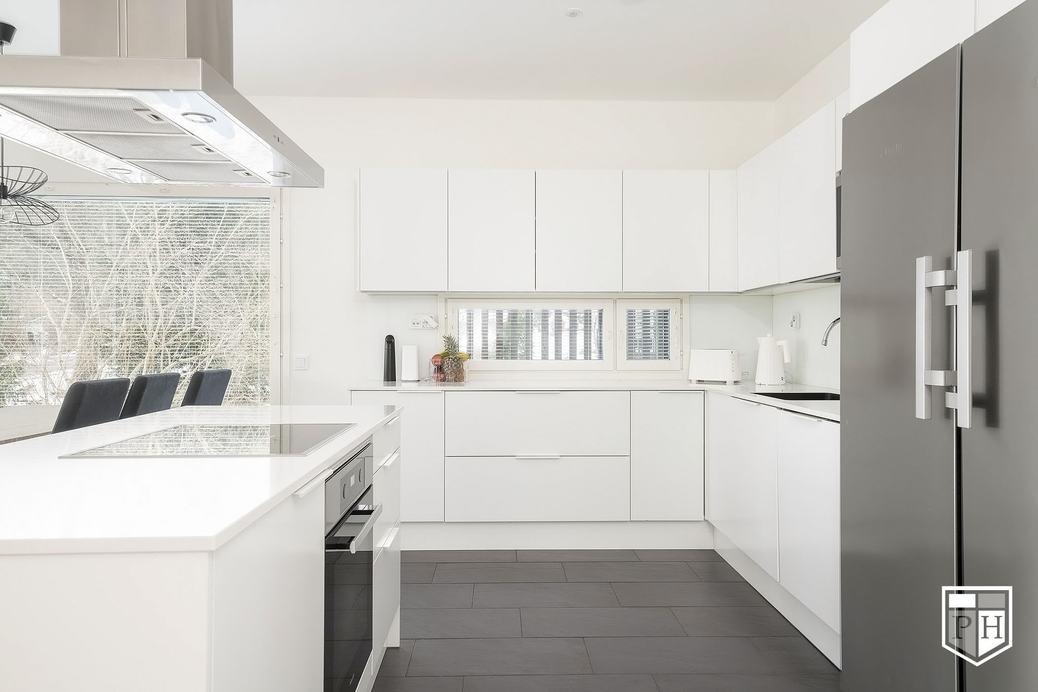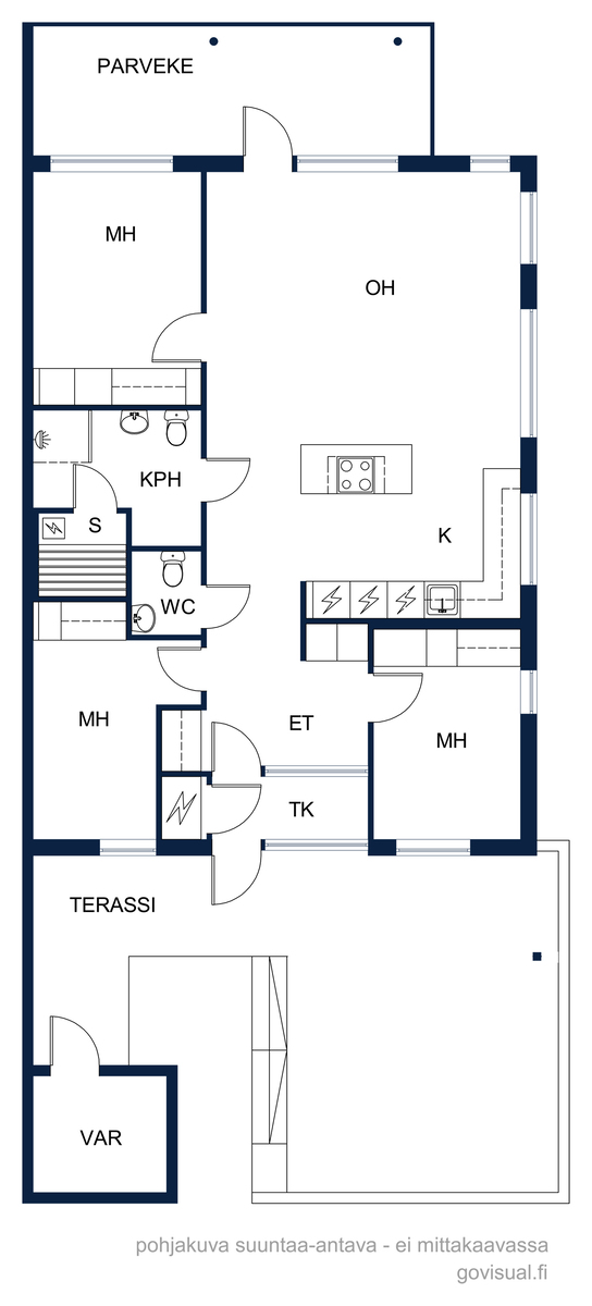 A la Carte -keittiö. Kivitasot. Mielen jääkaappi ja pakastin, erillisuuni, induktioliesitaso, integroitu astianpesukone. Electroluxin mikroaaltouuni. Elican liesituuletin. Lattia laattaa.