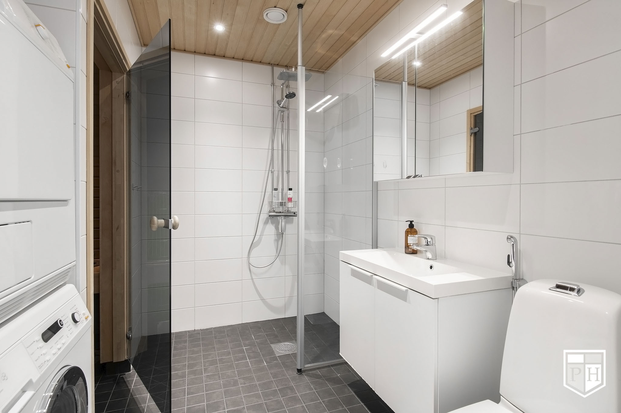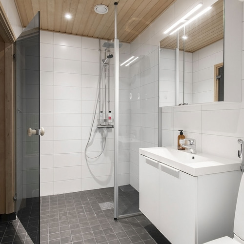 Wc-istuin, käsisuihku, pesuallas, allaskaappi, peili, suihku, suihkuseinä, pesukoneliitäntä. Lattia laattaa.