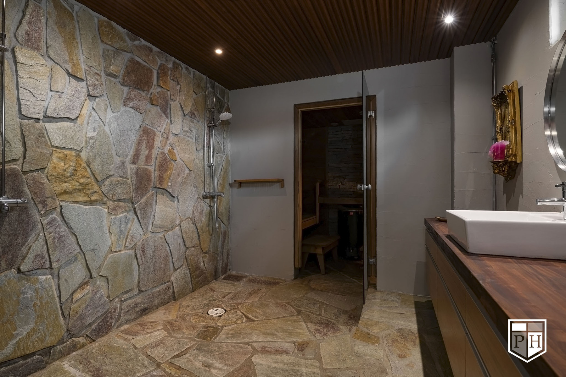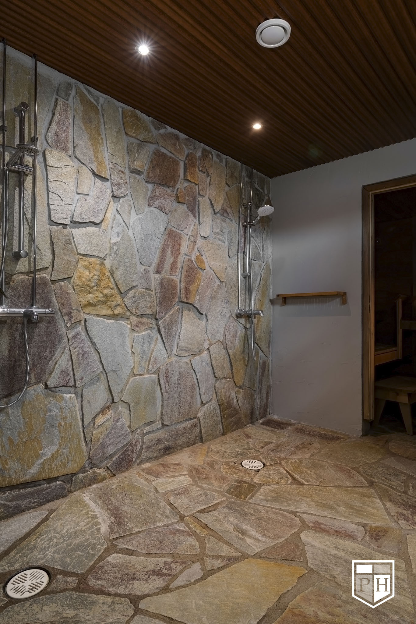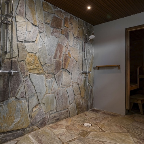 Kaksi suihkua, pesuallas, koko seinän mittainen taso ja allaskaapisto. Peili. Lattia ja osa seinistä Nilsiän Kvartsiittia.