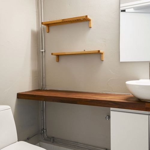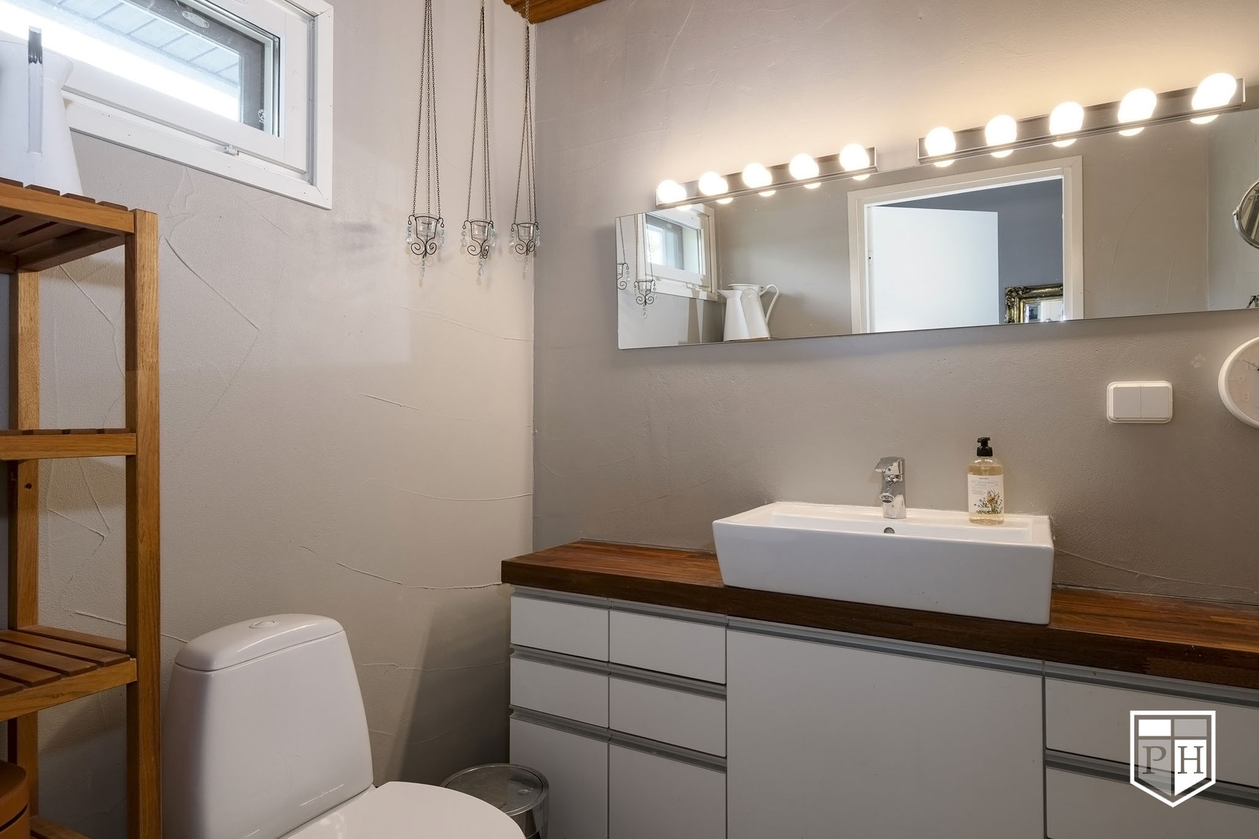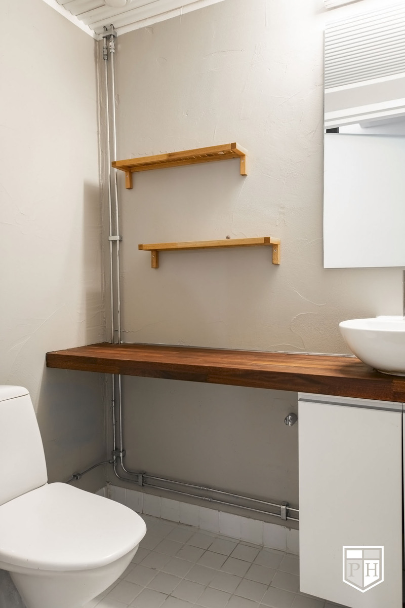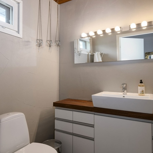 Yläkerran wc: Wc-istuin, pesuallas, allaskaappi, peili. Seinät maalattu ja lattia Nilsiän Kvartsiittia.