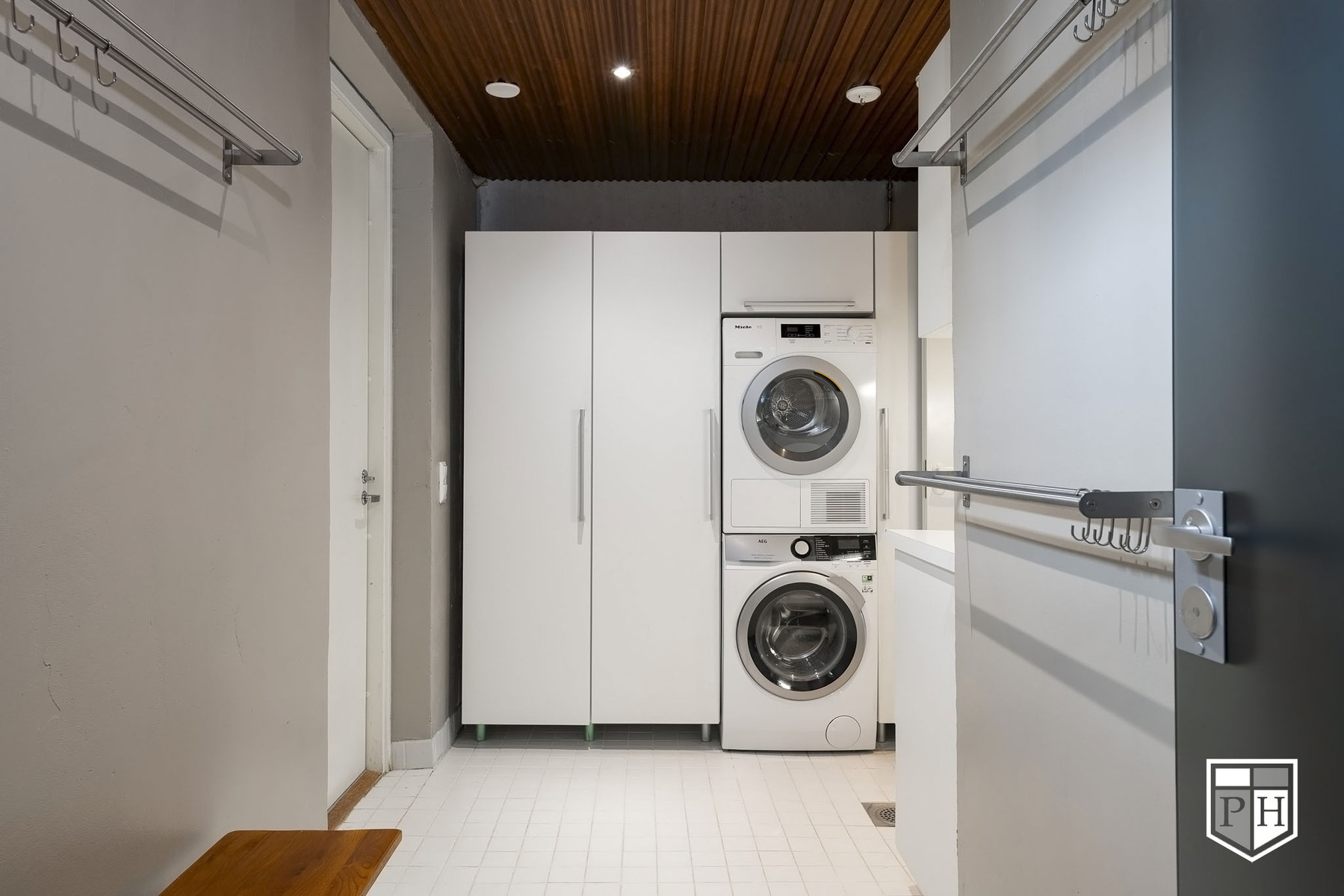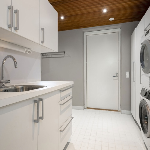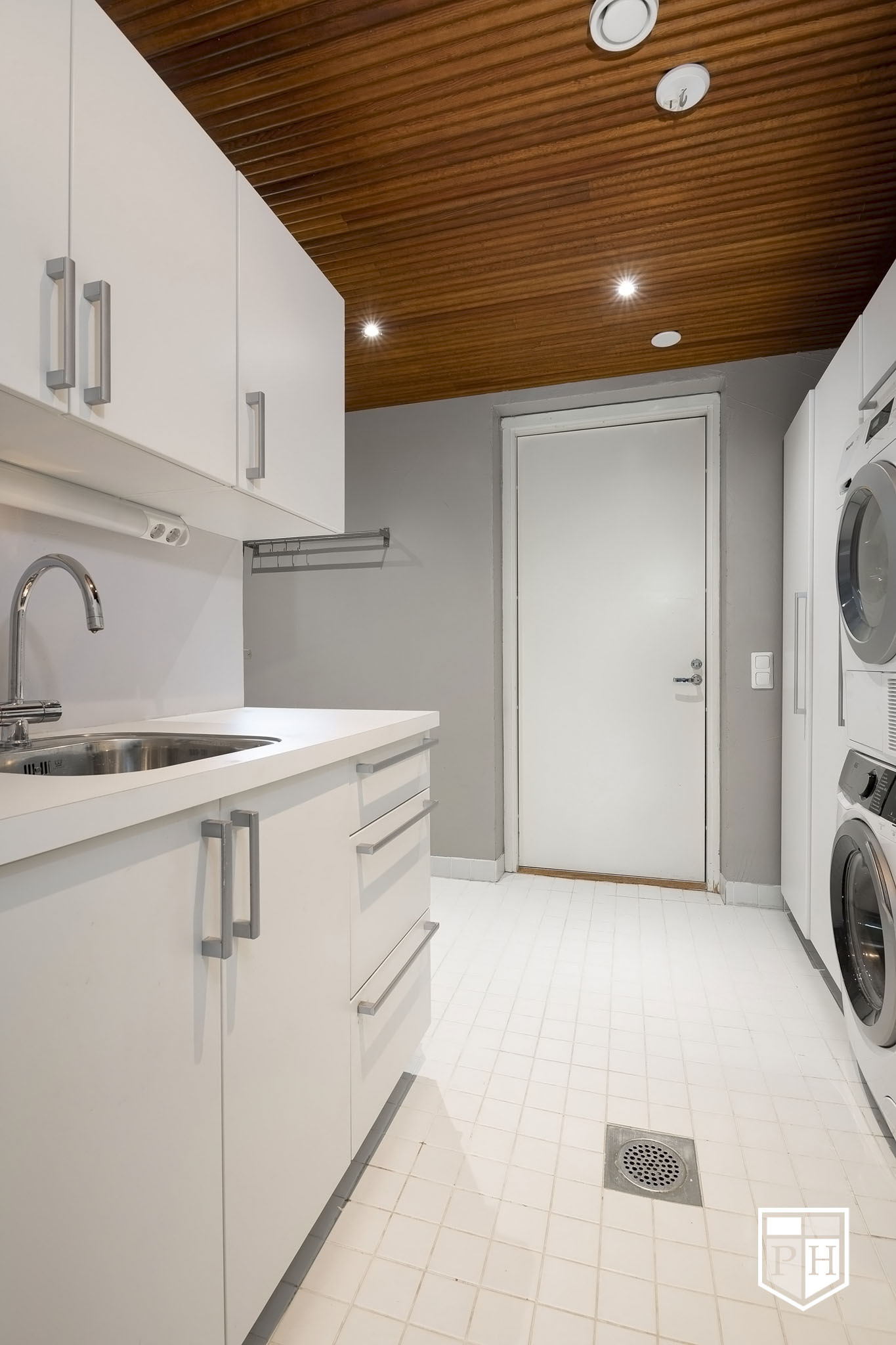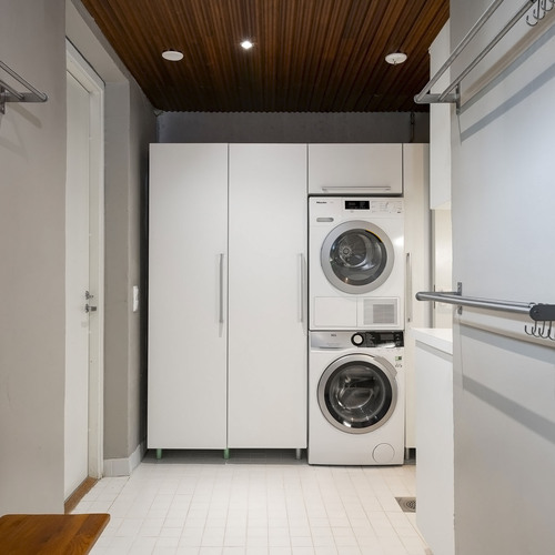 Taso, pesuallas ylä- ja ala kaapistot, pesukoneliitäntä. Tila pesukoneelle ja kuivurille, jonka yhteydessä korkea kaapisto. Seinät maalattu ja lattia laatoitettu.
