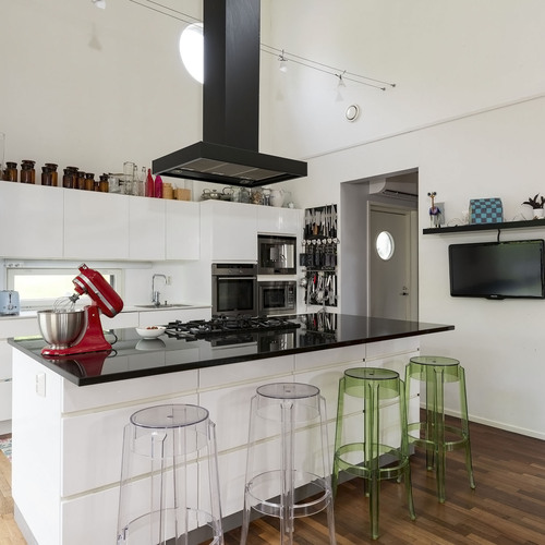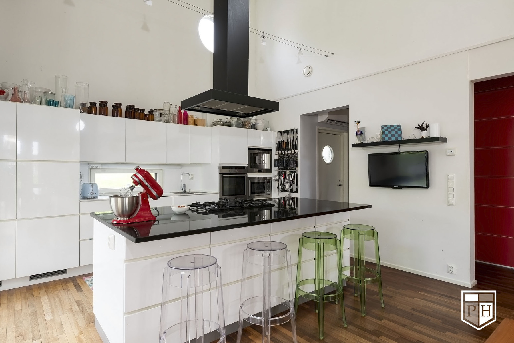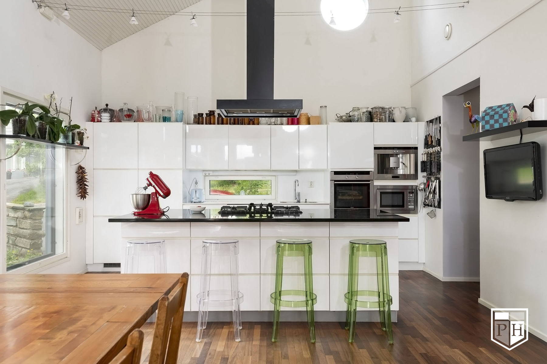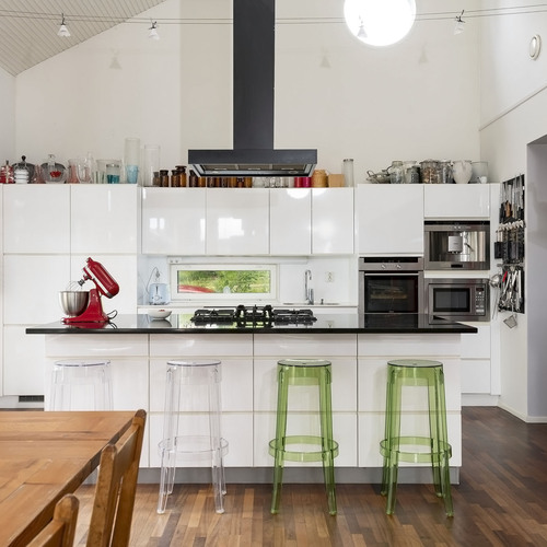 Korkeakiiltoiset Kvik-keittiön kaapistot. Lattia Jatoba-täystiikki.
