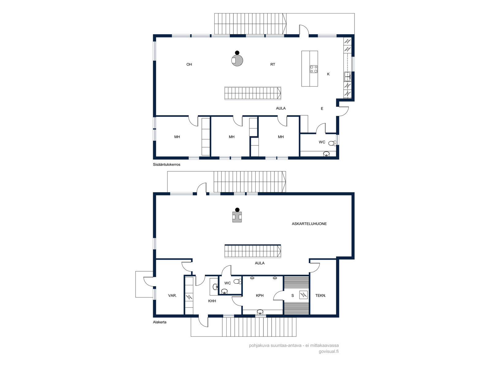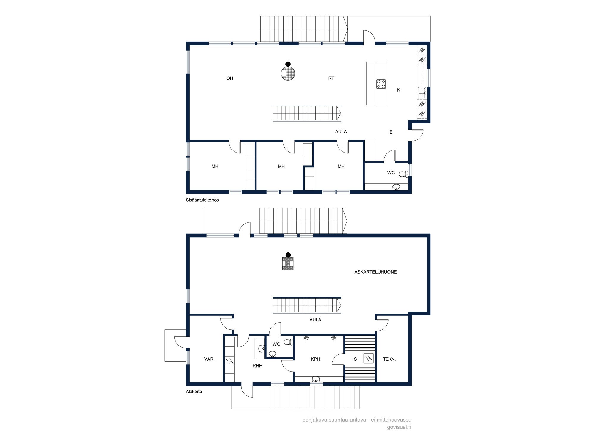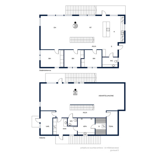 Yläkerrassa sijaitsevat kaikki kolme makuuhuonetta – arjen sujuvuutta parhaimmillaan. Alakerrasta löytyy näyttävä saunaosasto kahdella suihkulla, tilava kodinhoitohuone uloskäynnillä sekä iso, muuntautumiskykyinen oleskelutila. Alakertaan on mahdollista rakentaa lisähuone. Iso tila taipuu moneen tarpeeseen kuten etätyöhön, vierashuoneeksi tai harrastetilaksi. Molemmissa kerroksissa on tunnelmallinen takka tuomassa lämpöä ja luomassa tunnelmaa.