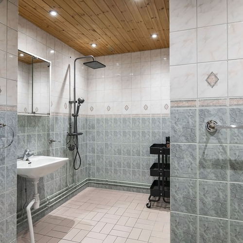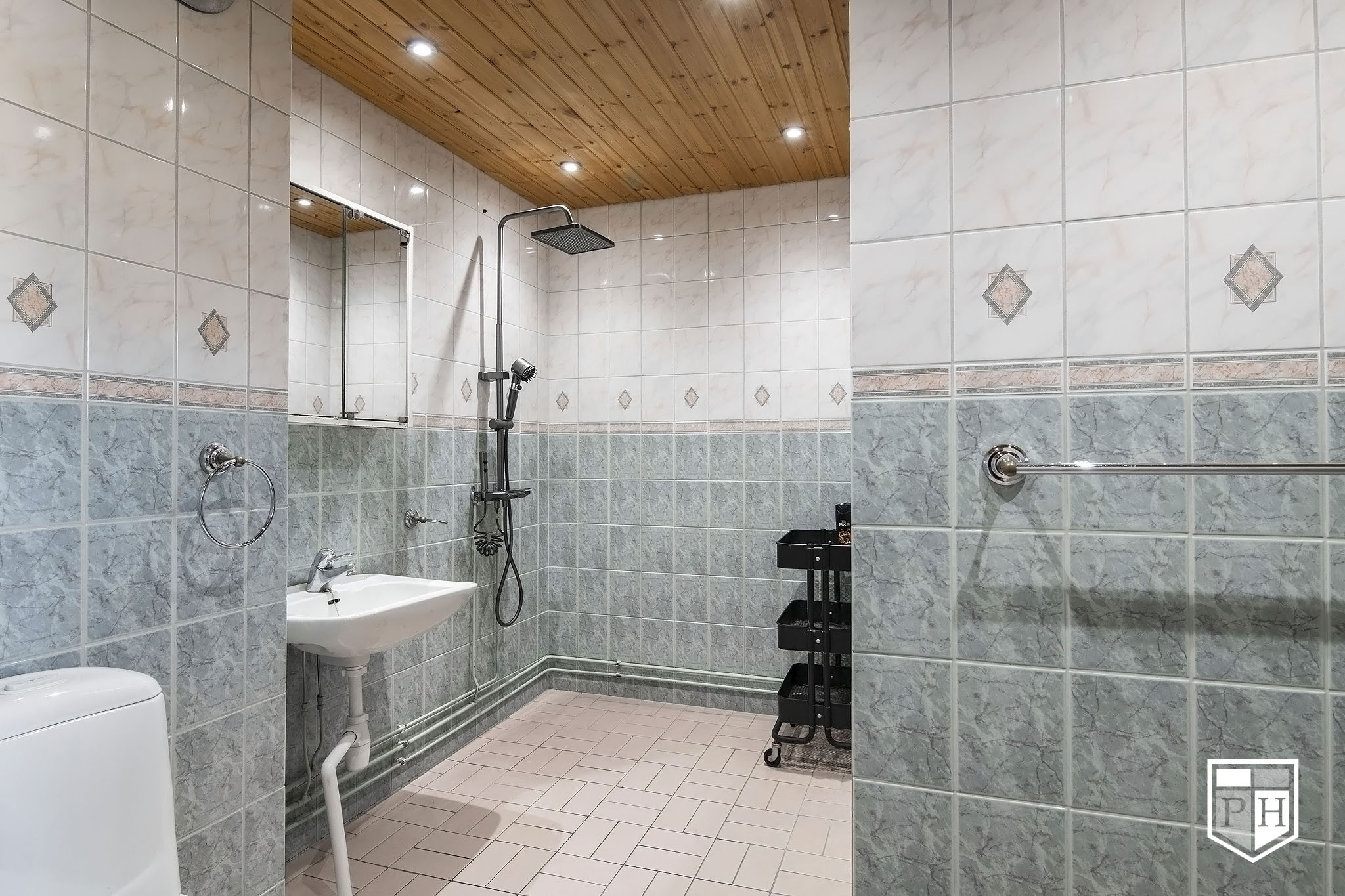 Seinät ja lattia laatoitettu, lattialämmitys. Suihku, wc-istuin, pesuallas, peilikaappi (2026).