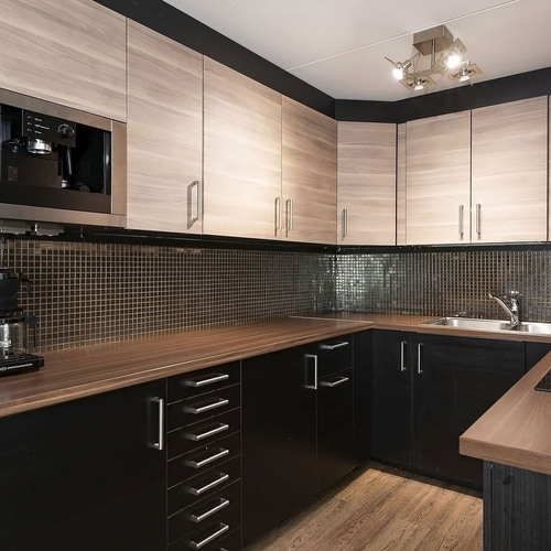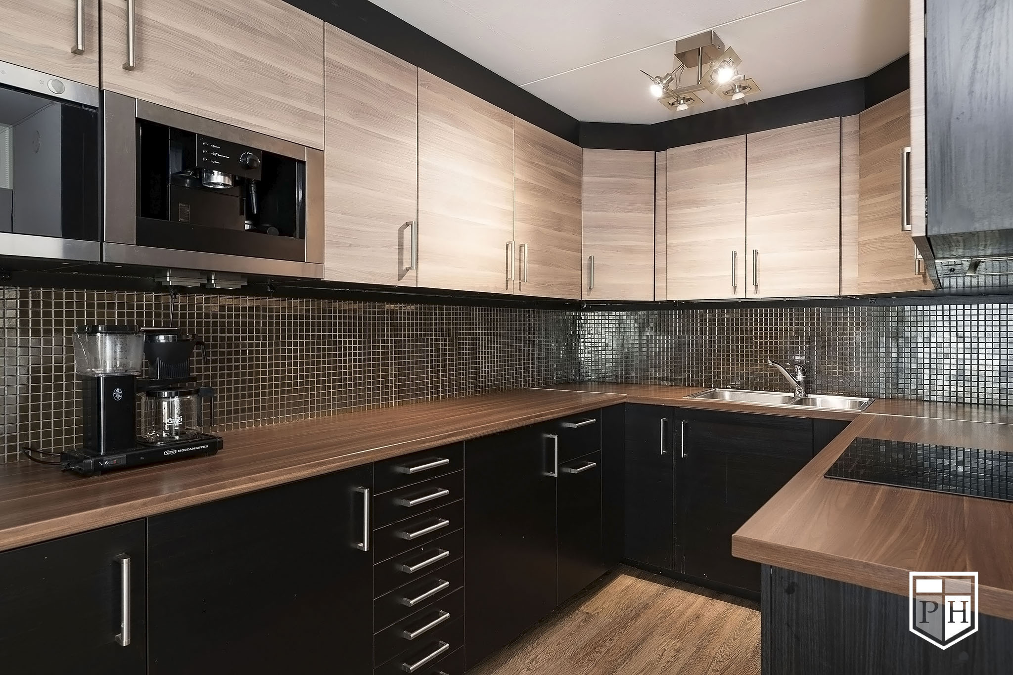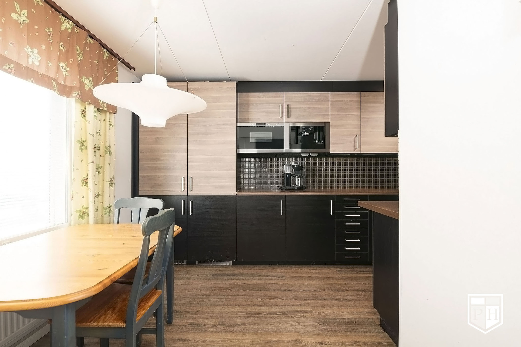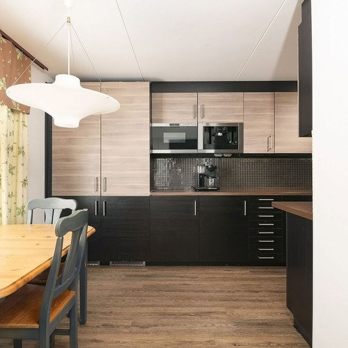 Induktioliesitaso, liesituuletin, kalusteuuni, 2 x jääkaappipakastin, astianpesukone, integroitu mikro. Lattia vinyylikorkkia. Remontoitu noin 5 vuotta sitten.