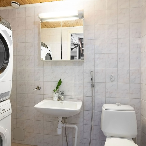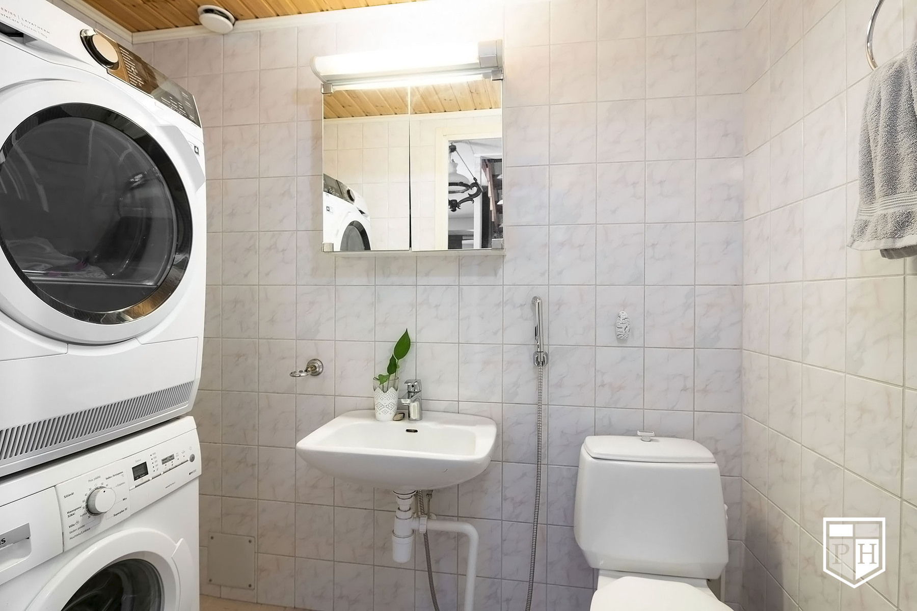 Seinät ja lattia laatoitettu. Wc-istuin, pesuallas, pesukoneliitäntä.