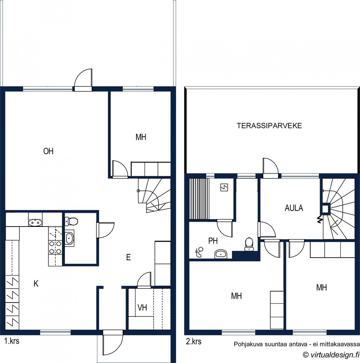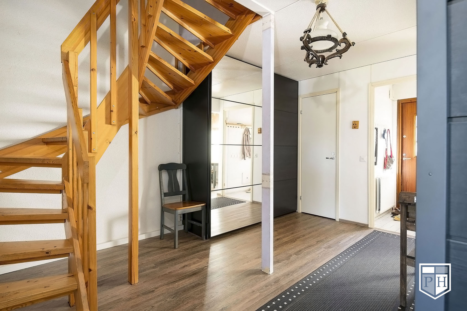 Alakerrassa on viitisen vuotta sitten remontoitu tyylikäs keittiö, tilava olohuone, josta on käynti länsipihalle, sekä yksi makuuhuone, wc ja eteinen kätevin kaapistoratkaisuin. Yläkerrassa on kaksi makuuhuonetta, saunaosasto sekä viihtyisä 24 m² terassiparveke, joka tarjoaa loistavat puitteet rentoutumiseen ja seurusteluun. Yläkertaan on asennettu ilmalämpöpumppu viilennystä varten. Säilytystilaa on runsaasti: käytössäsi on kaapistojen ja vaatehuoneen lisäksi ulkovarasto sekä lämmin kellarikomero.