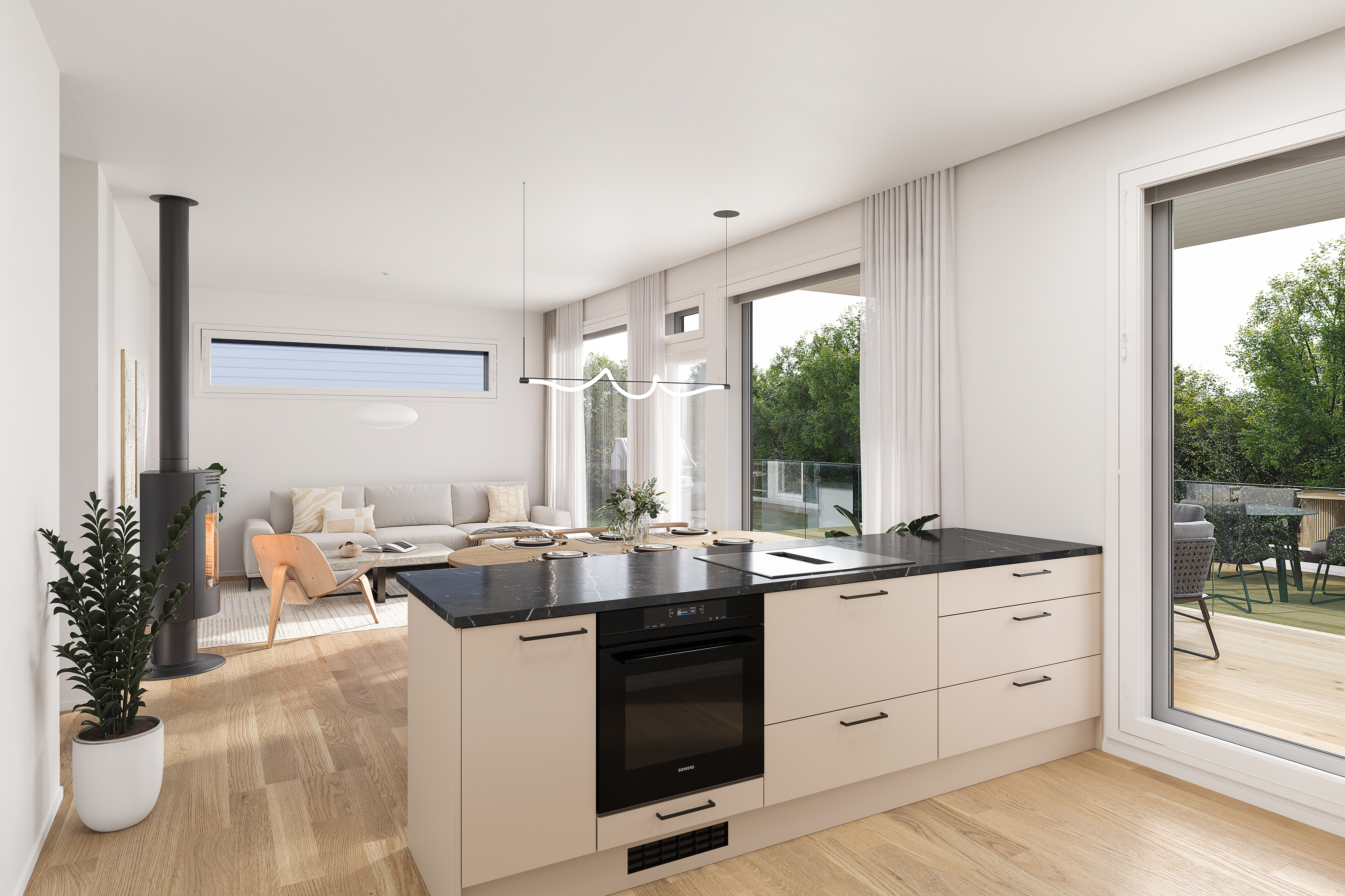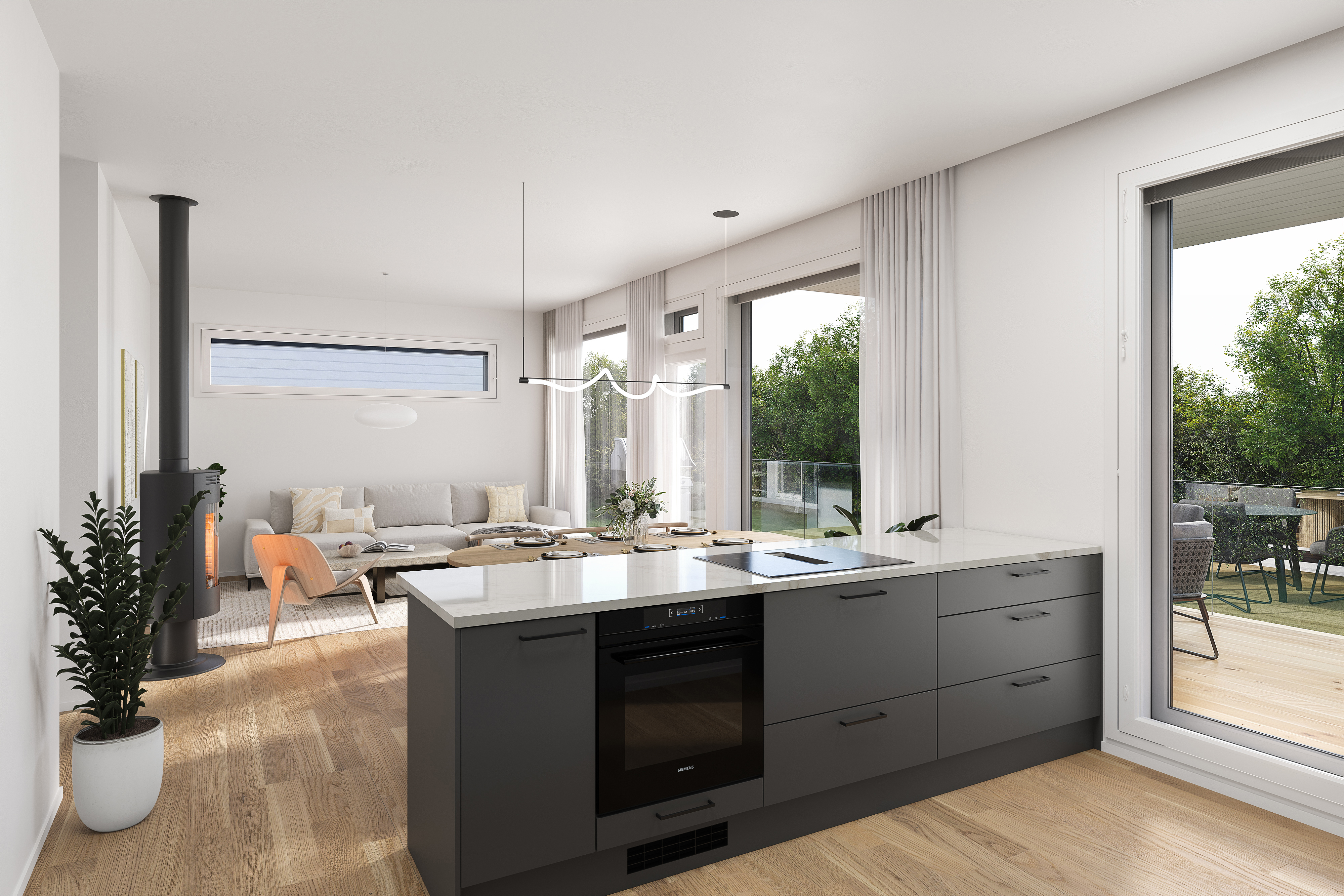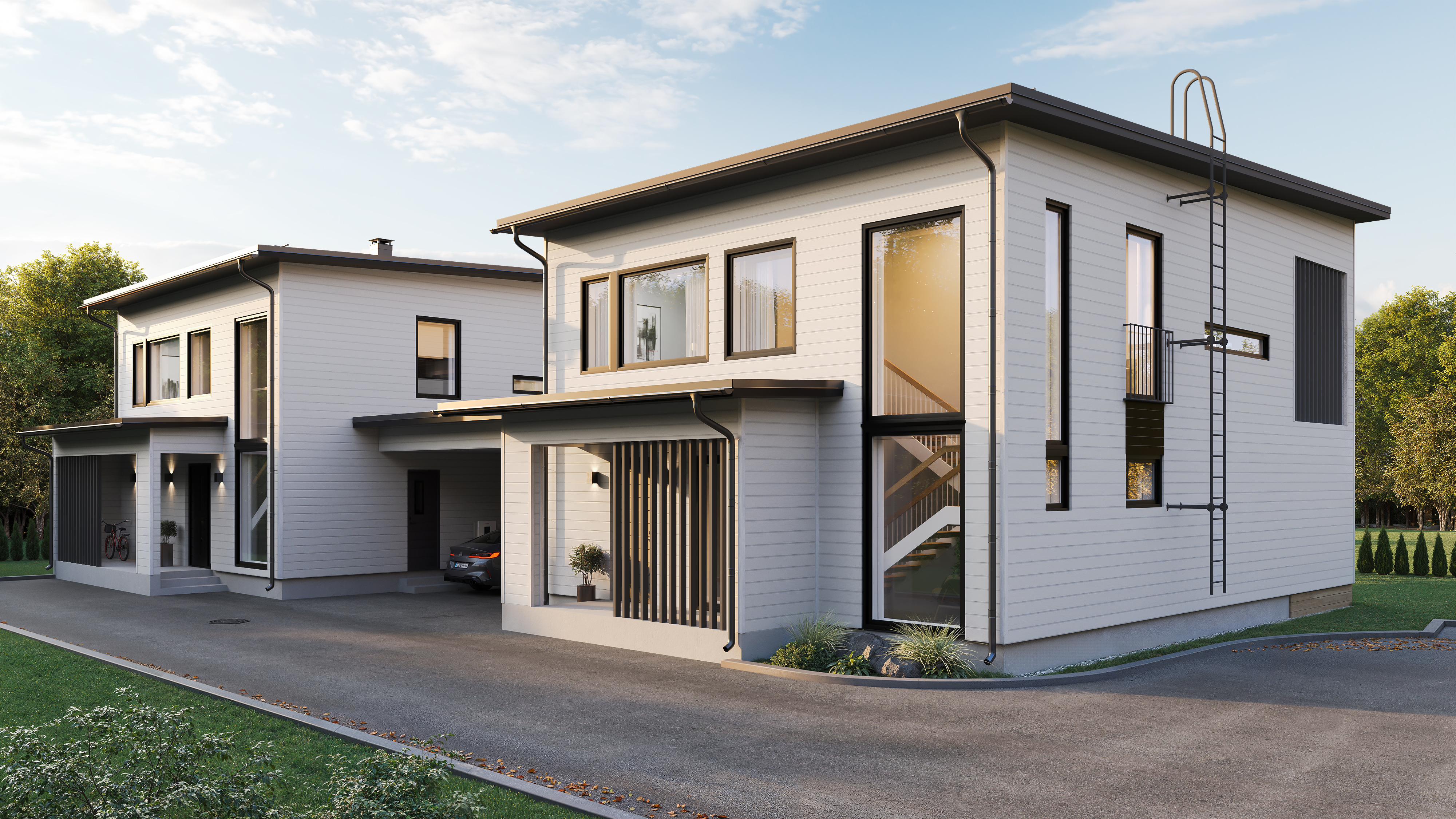 Valoisat sisätilat, suuret ikkunapinnat sekä lounaaseen avautuvat terassit ja parvekkeet luovat viihtyisän ja avaran tunnelman. Julkisivut ovat tyylikkään valkoiset, kokonaisuutta täydentävät tummanharmaat katto-, ovi-, ikkuna- ja korostusverhoukset. Tehokas pohjaratkaisu taipuu moninaisiin käyttötarkoituksiin. Yläkerran leveä ja hyvin kalustettava katettu parveke yhdistettynä olohuone/ruokailuhuone -tiloihin tarjoaa mahtavat puitteet juhlaan ja illanviettoon. Alakerran huoneet sopivat mainiosti esim. etätyöhuoneeksi, mediahuoneeksi, kuntoilutilaksi, vierashuoneeksi ym. Taloihin kuuluu lisäksi katettu 28 m² terassi, sekä pääosin katettu 3 metriä leveä 28 m² parveke lasikaiteella ja 22 m² autokatos.