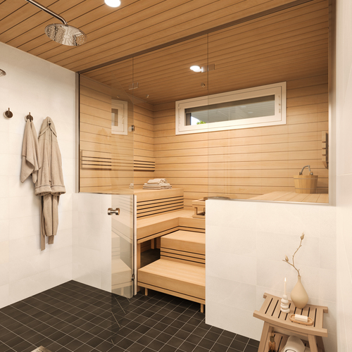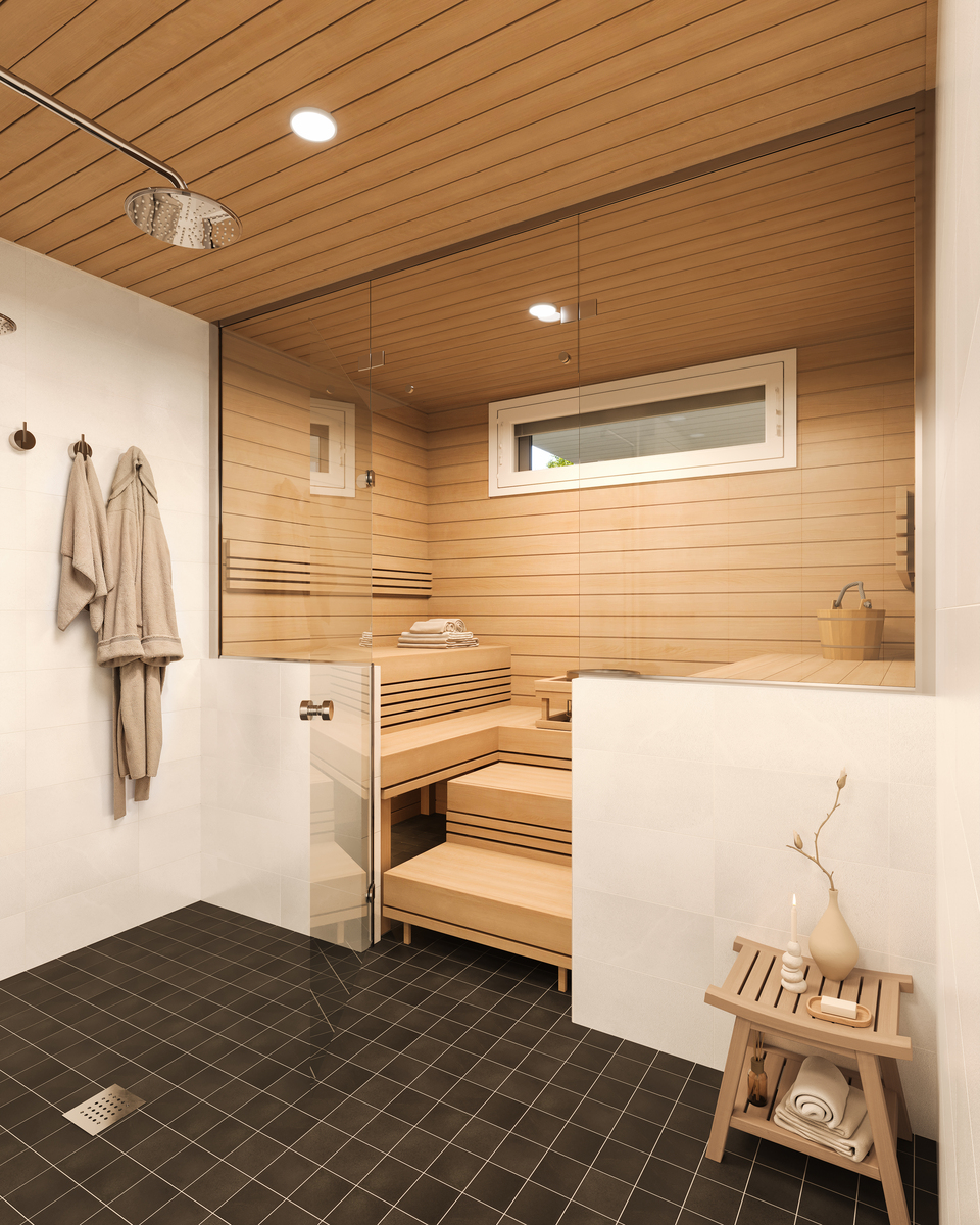 Seinät paneloitu, lattia laattaa. Harvia Cilindro pilarikiuas.