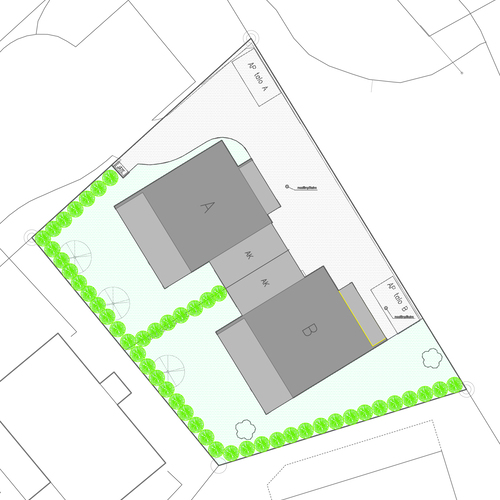 korttelissa 49, tontilla 3. Tontti jaetaan hallinnanjakosopimuksella talojen A ja B kesken.