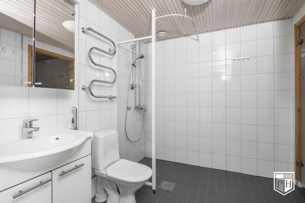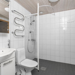 Kylpyhuoneen kuvaus | Seinät ja lattia laatoitettu. Lattialämmitys, jonka sähkökulut sisältyvät hoitovastikkeeseen. Suihku, suihkuseinä, wc-istuin, käsisuihku. Pesuallas, allaskaappi, peilikaappi. Pyykkikaappi. Kuivauspatteri. Pesukoneliitäntä. Ilmanvaihtokone, jonka säätö liesikuvusta. |