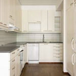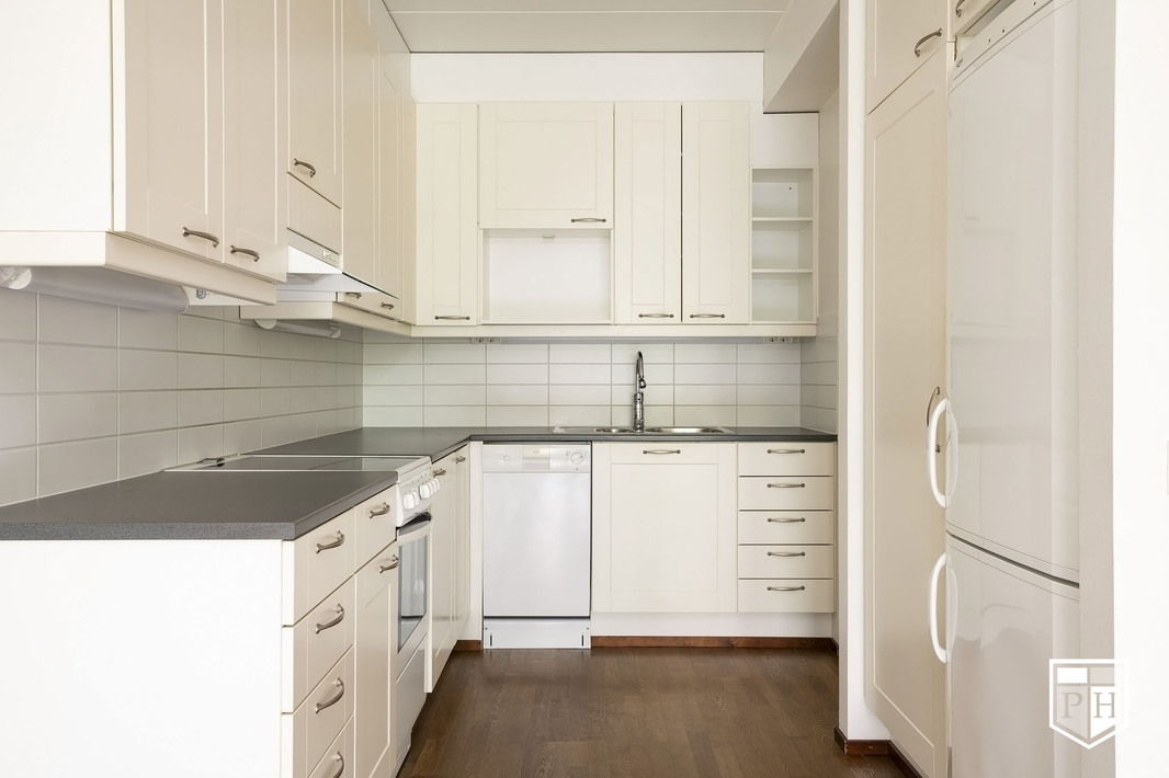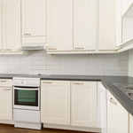 Keittiön varustelu | Valkoiset kaapistot, harmaat tasot, välitila vaaleaa laattaa. Keraaminen liesi. Liesikupu, jossa koneellisen ilmanvaihdon säätö. Astianpesukone. Jääkaappipakastin. Lattia parkettia. |