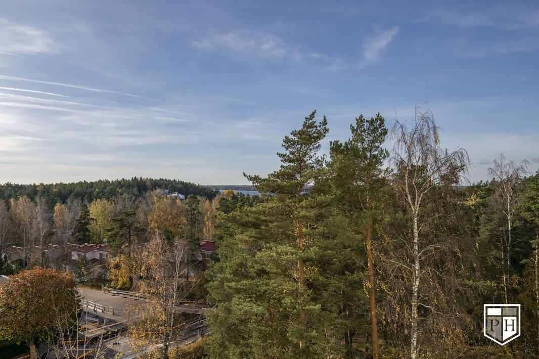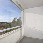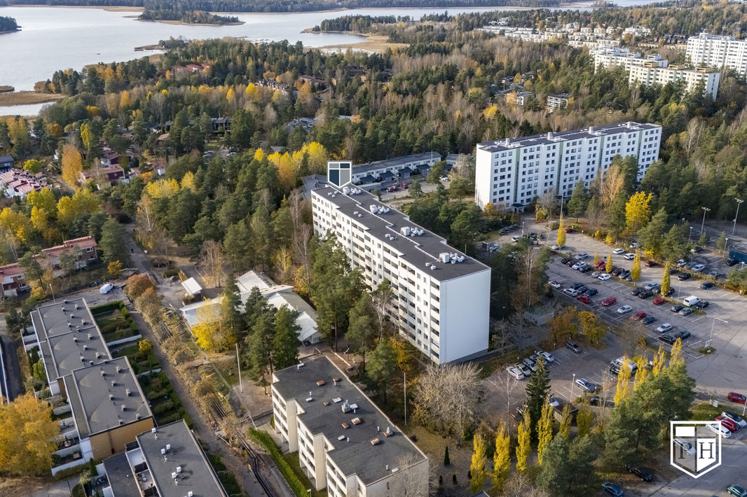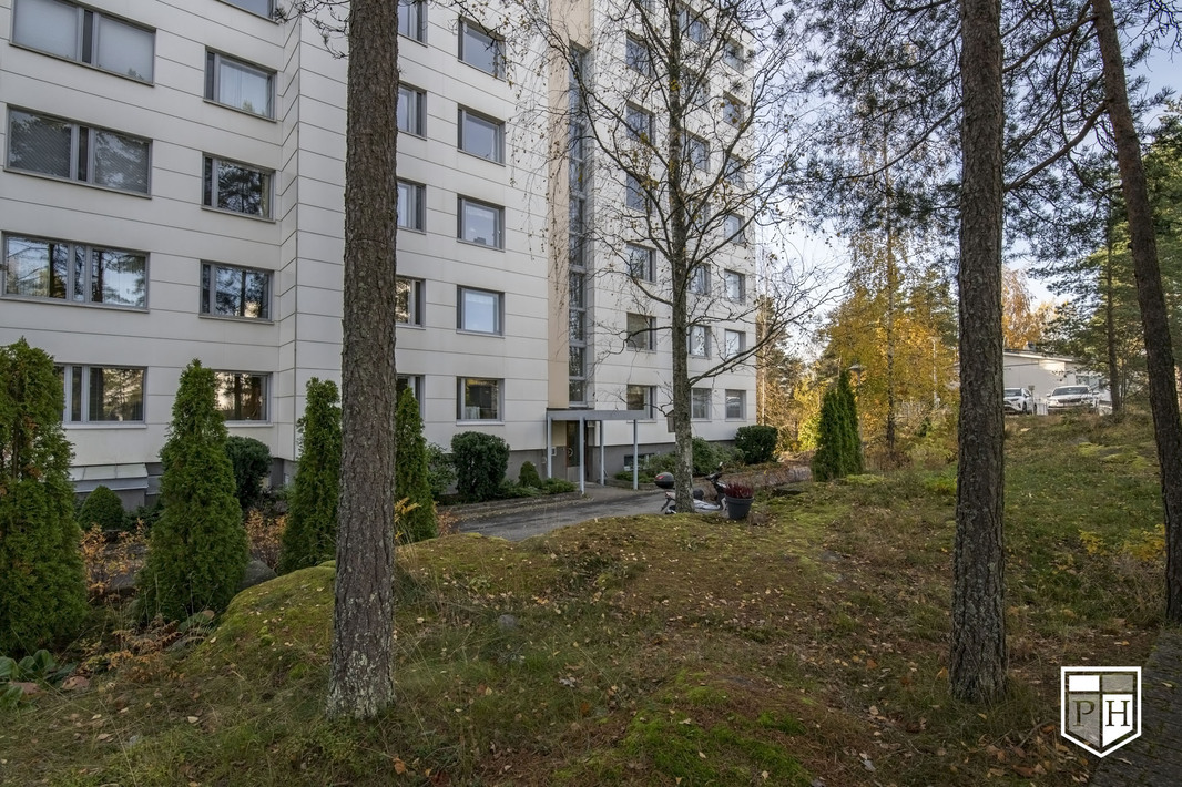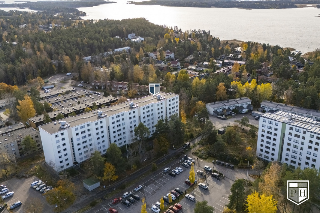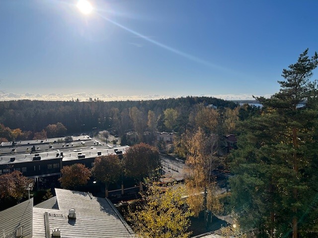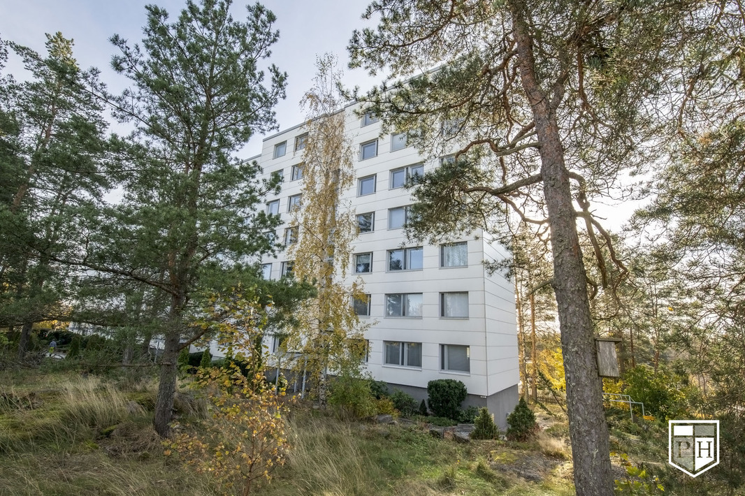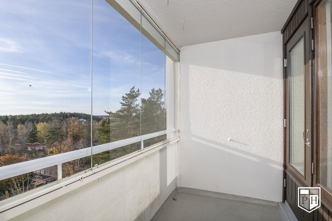 Viidennen kerroksen näköalahuoneisto hissitalossa rauhallisella paikalla päättyvän kadun päässä. Upeat, esteettömät näkymät horisonttiin, merikin näkyy puiden lomitse. Lasitettu parveke etelän suuntaan.