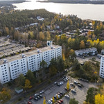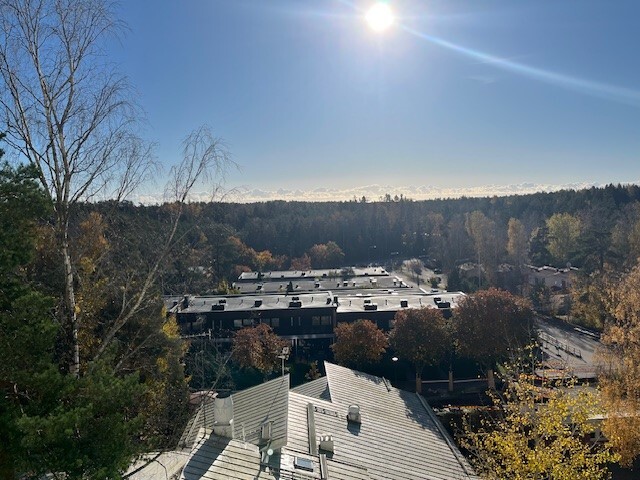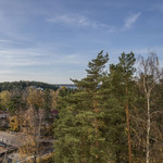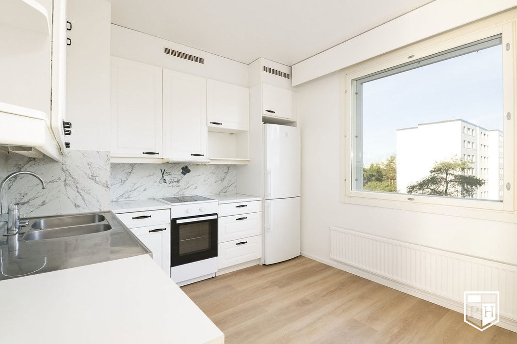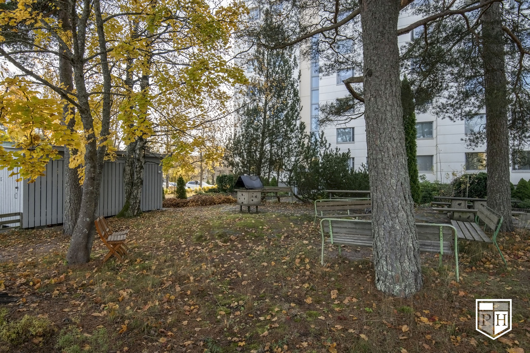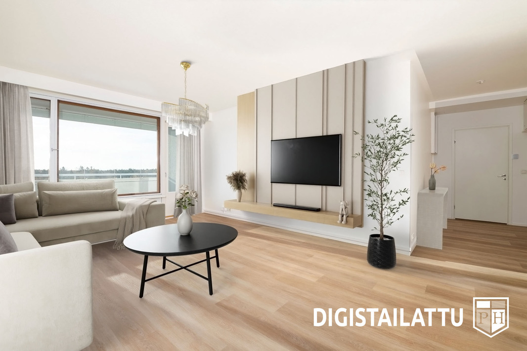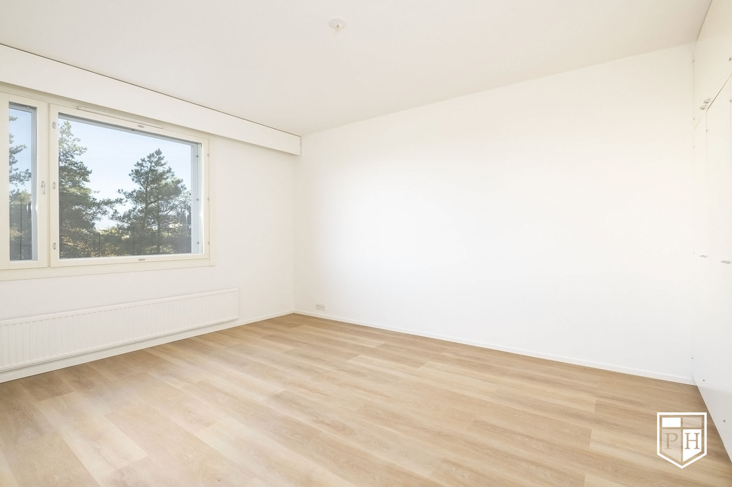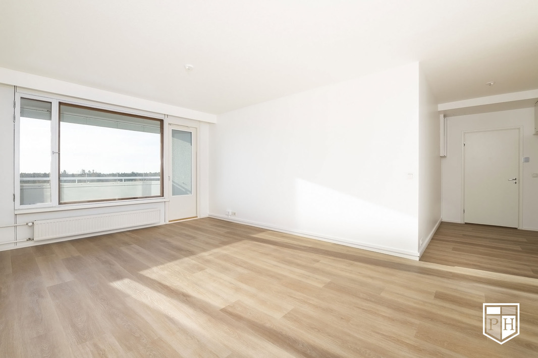 Viidennen kerroksen näköalahuoneisto hissitalossa rauhallisella paikalla päättyvän kadun päässä. Upeat, esteettömät näkymät horisonttiin, merikin näkyy puiden lomitse. Lasitettu parveke etelän suuntaan.