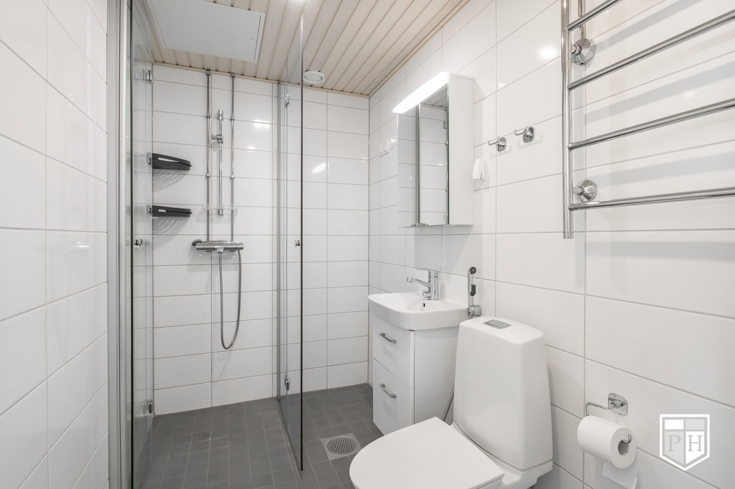 | Kylpyhuoneen kuvaus | Uusittu 2022 putkiremontin yhteydessä. Seinät ja lattia laatoitettu, lattialämmitys. Suihku, suihkuseinät, wc-istuin, käsisuihku. Pesuallas, allaslaatikot, peilikaappi. Pyyhekuivain, pesukoneliitäntä. |