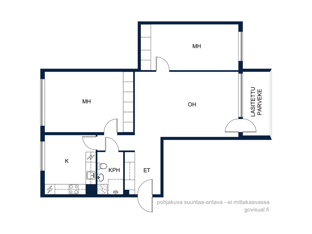 | Huoneistoselitelmä | 3h, k, kph + lasitettu parveke |