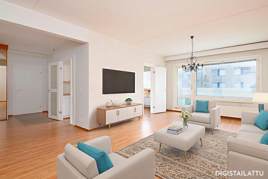 Avarassa olohuoneessa on tilaa oleskelulle ja yhteisille hetkille, sieltä on käynti lasitetulle länsiparvekkeelle, joka tarjoaa lisätilaa ja mukavuutta pitkälle syksyyn.