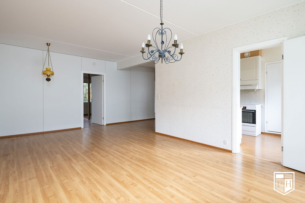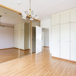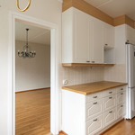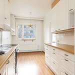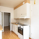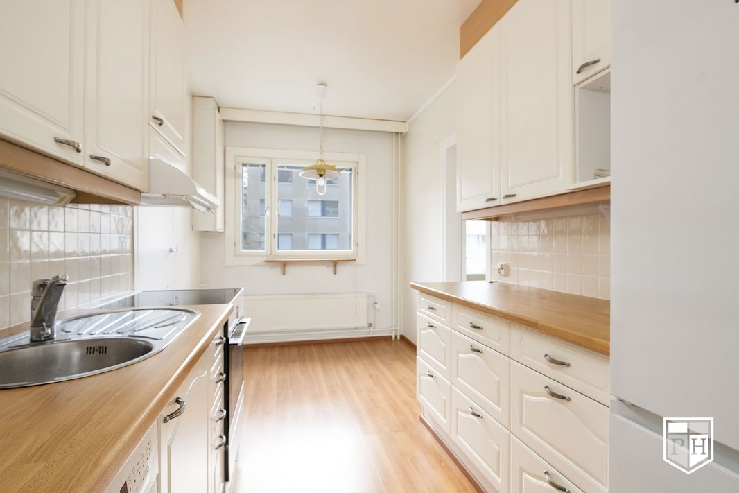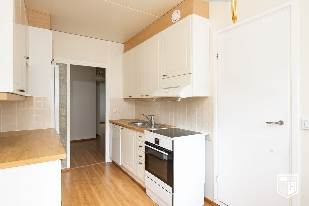 | Keittiön varustelu | Kaapistot, laminaattitasot. Samsungin jääkaappipakastin. Gramin keraaminen liesi. Siemensin astianpesukone. Liesituuletin. Lattia laminaattia. |