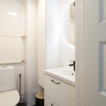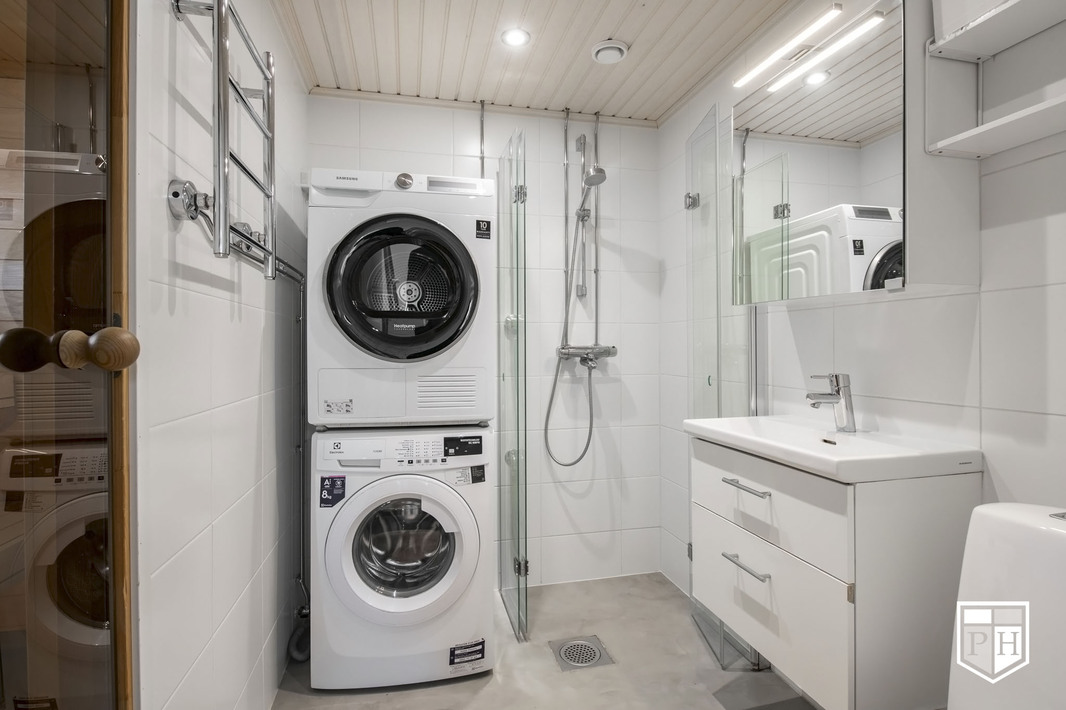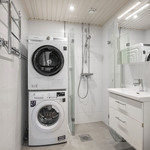| Kylpyhuoneen kuvaus | Suihku, suihkuseinä, wc-istuin, pesuallas, allaslaatikosto, peilikaappi, pyyhekuivain, pesukoneliitäntä. Katto paneelia, seinät ja lattia laattaa, lattialämmitys. LED-valaisimet. Pesuhuone remontoitu 2017. |