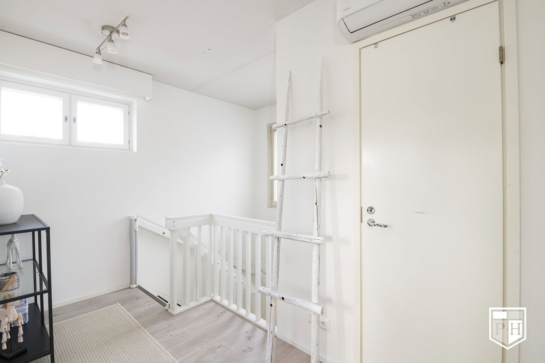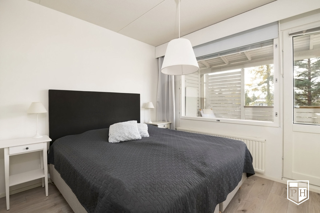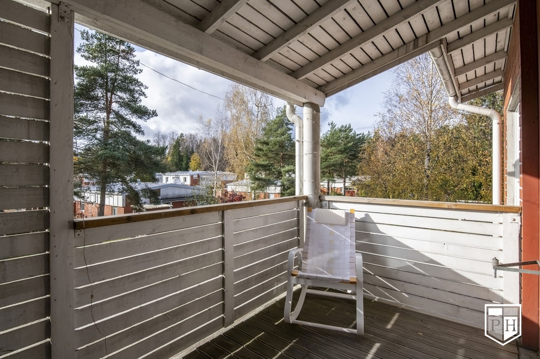 Yläkerrassa on kaksi tilavaa makuuhuoneetta sekä uusittu pesuhuone ja sauna. Saunan vilvoitteluhetket vietetään suojaisella länsiparvekkeella. Aulatilan ilmalämpöpumppu viilentää helteisinä kesinä koko asunnon.