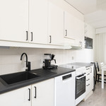 | Keittiön varustelu | Valkoiset kaapistot, laminaattitasot. Jääkaappi, pakastinkaappi, keraaminen liesi, liesikupu huippuimurilla, komposiittipesuallas. Lattia laminaattia. |