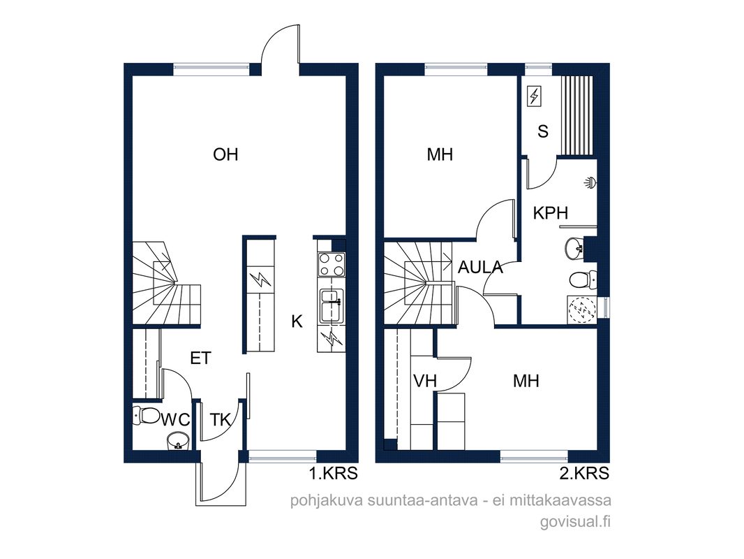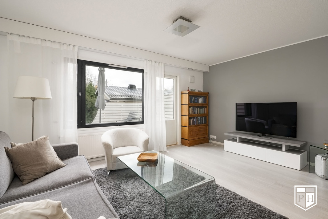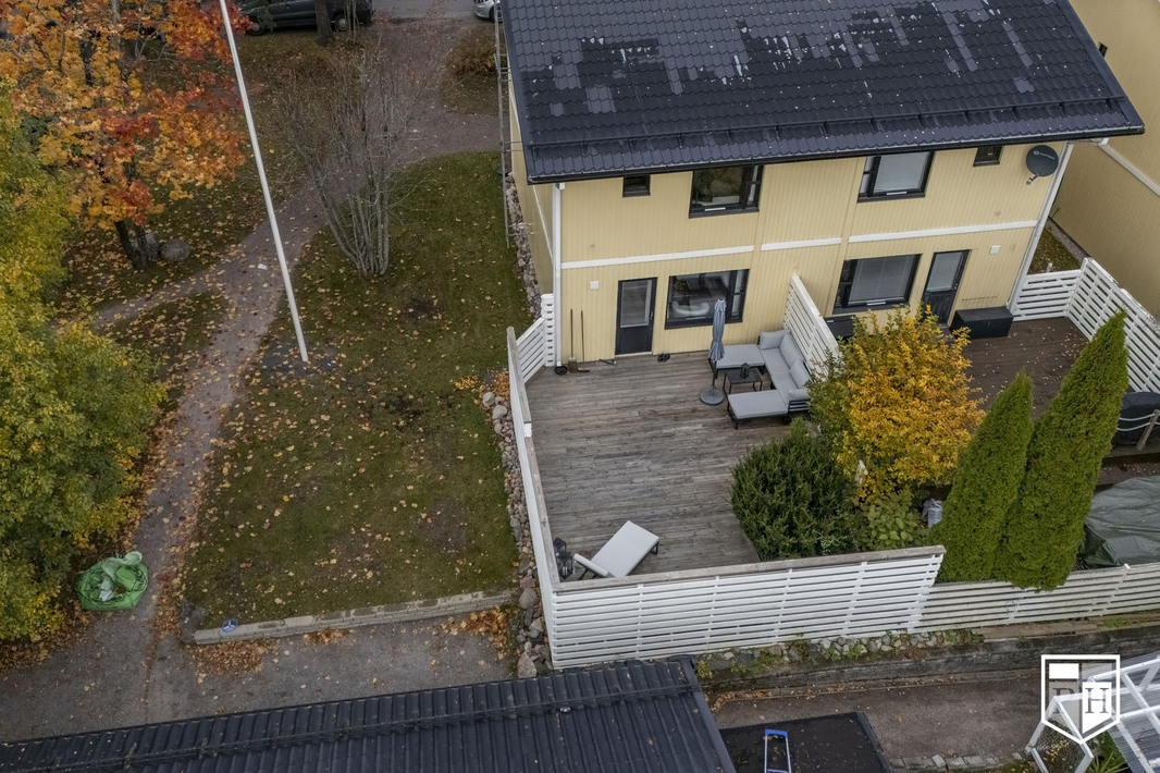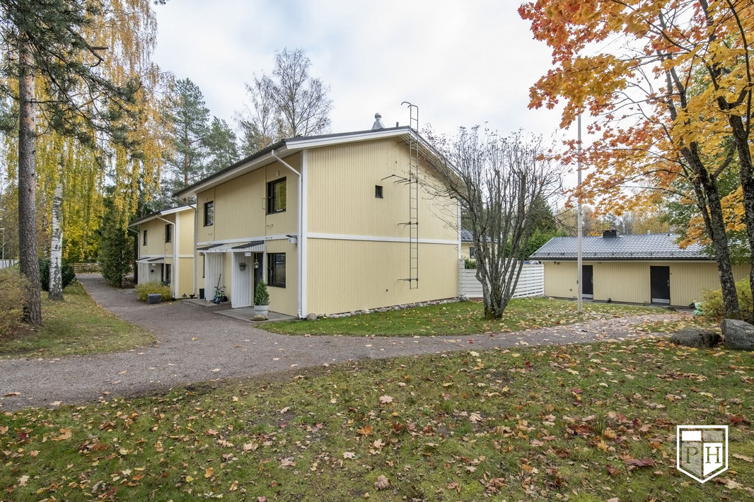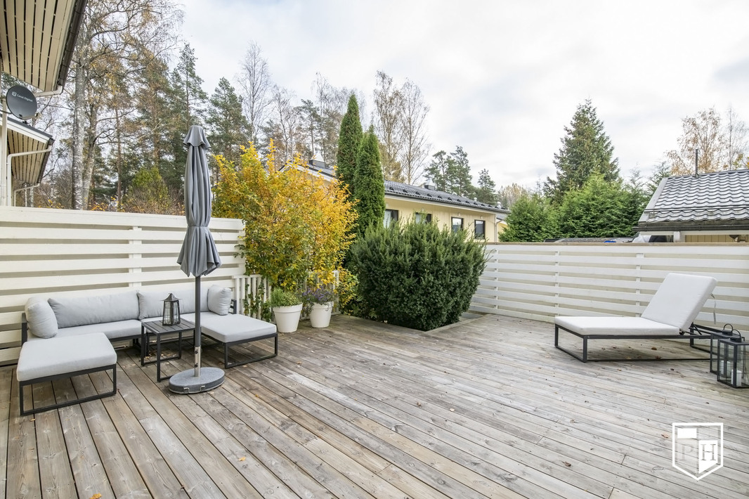 Alakerrassa on olohuone, keittiö, eteinen ja erillinen wc. Vuonna 2020 uusitussa keittiössä on modernit integroidut kodinkoneet, valkoiset yläkaapit ja tummat alakaapit. Keittiöön mahtuu ruokailuryhmä. Uusittu wc on katseilta suojassa eteisaulan kulmassa. Uusitut saunatilat, jotka palvelevat perhettä kotoisissa saunailloissa. Yläkerrassa on kaksi valoisaa, tilavaa makuuhuonetta ja iso, koko pihan kattava terassi on etelään.