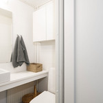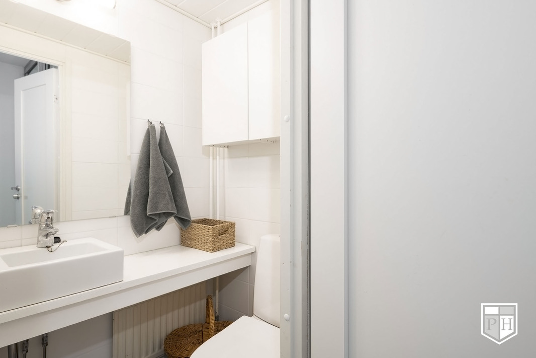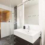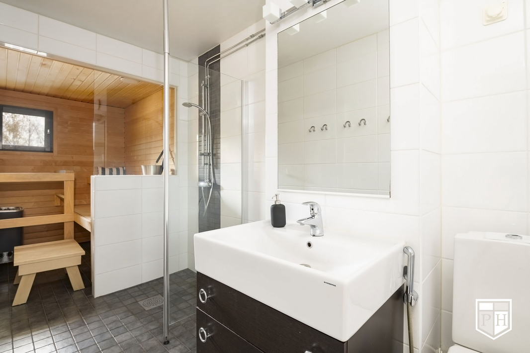 | Kylpyhuoneen kuvaus | Suihku, suihkuseinä, wc-istuin, käsisuihku, pesuallas, allaslaatikosto, peili. Seinäkaapit. Pesukoneliitäntä. LED-valot. Seinät ja lattia laattaa. Ikkuna. |
