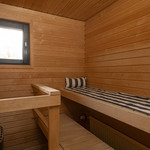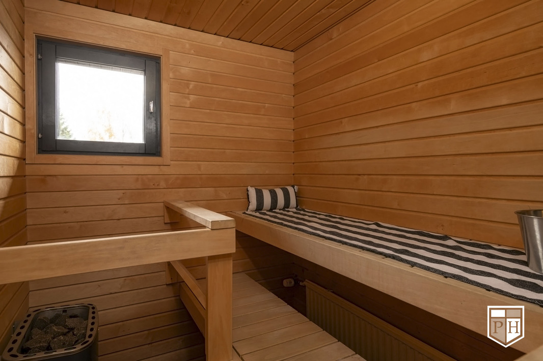 | Saunan kuvaus | Saunan ja pesuhuoneen välinen seinä osittain lasia, lasiovi. Katto ja seinät paneelia, lattia laattaa. Ikkuna. |