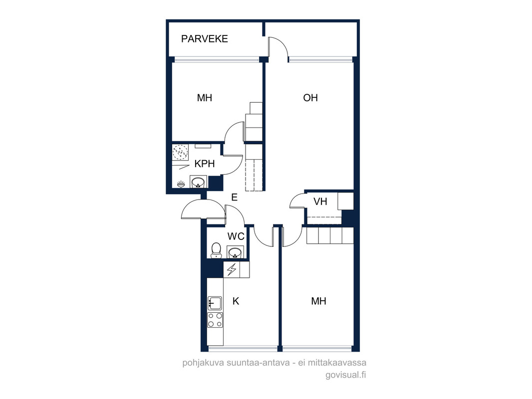 | Huoneistoselitelmä | 3h, k, vh, kph, wc + lasitettu parveke |