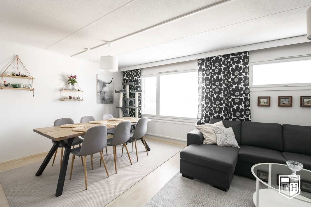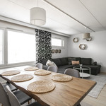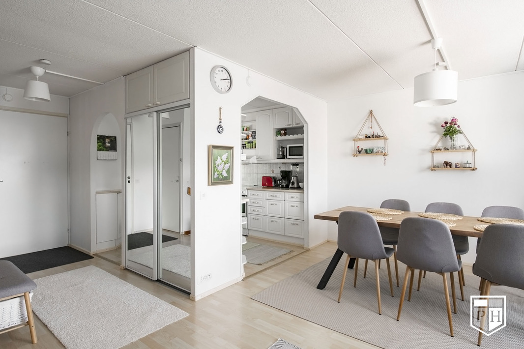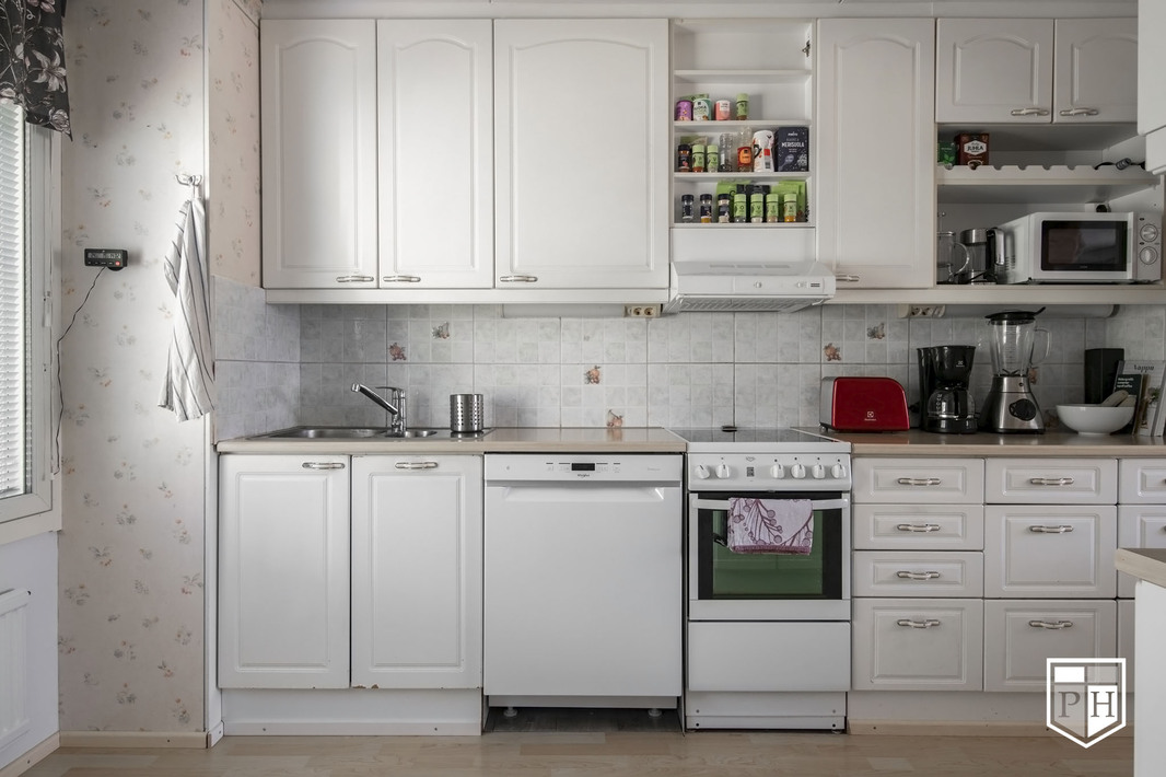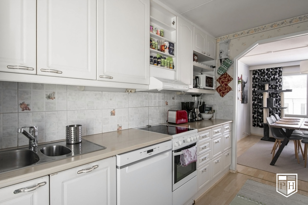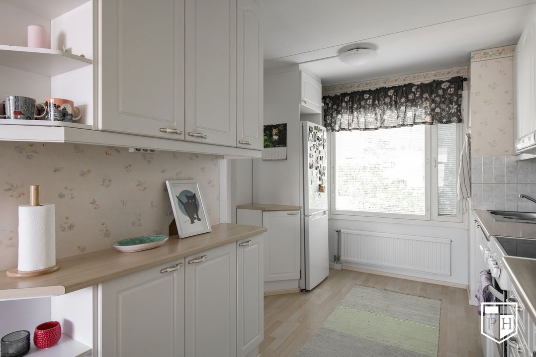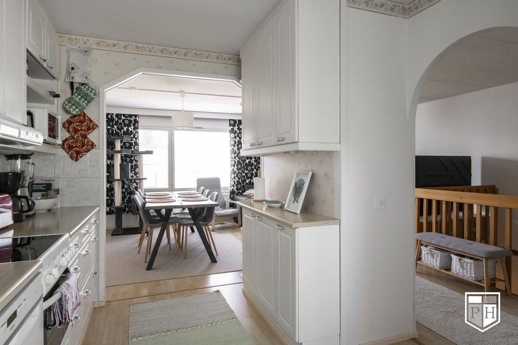 | Keittiön varustelu | Keraaminen liesi, liesituuletin, astianpesukone (12/2023), jääkaappipakastin. Lattia laminaattia. |