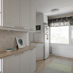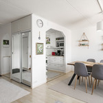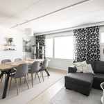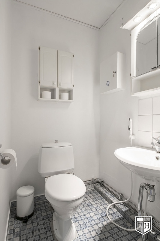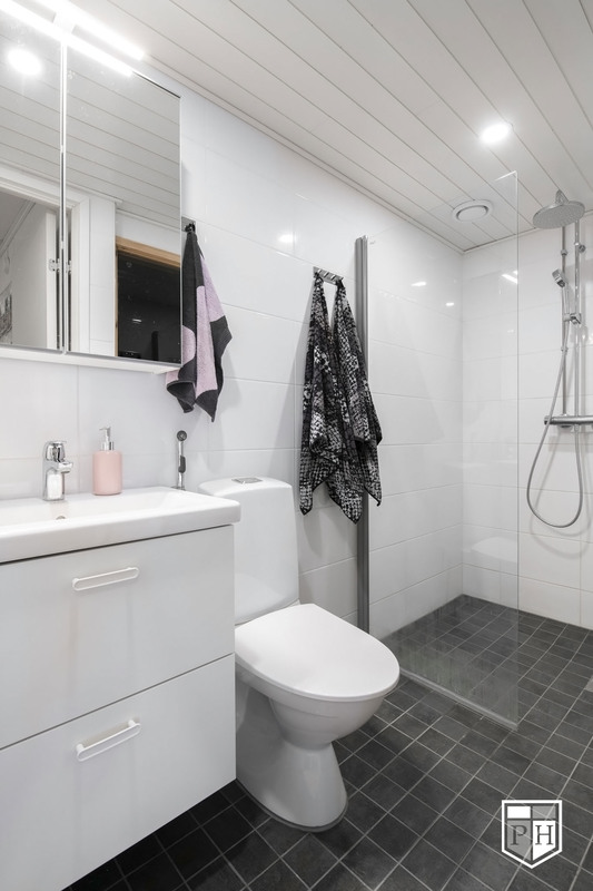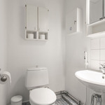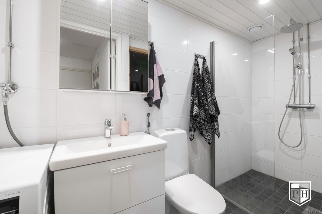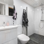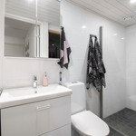 | Kylpyhuoneen kuvaus | Lattia ja seinät laatoitettu, lattialämmitys, suihku, wc-istuin, pesuallas, allaslaatikosto, käsisuihku, pesukoneliitäntä, peilikaappi. Remontoitu keväällä 2022. |