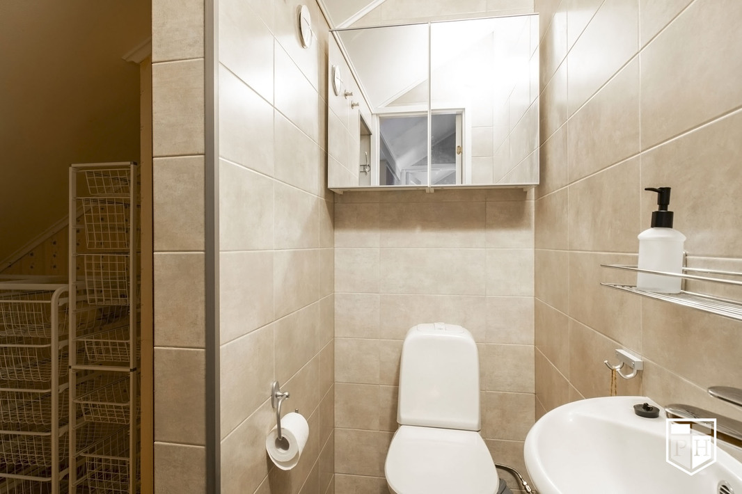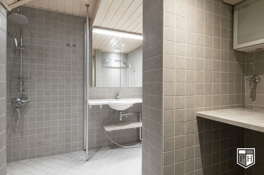| Kylpyhuoneen kuvaus | Kylpyhuone remontoitu 2022. Varusteet: sadesuihku, peilikaappi, pesuallas, käsisuihku, wc-istuin, pesukoneliitäntä. Seinät ja lattia laattaa, sähköinen lattialämmitys. |