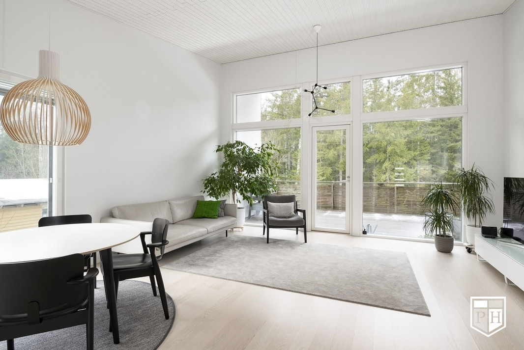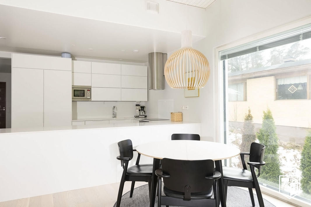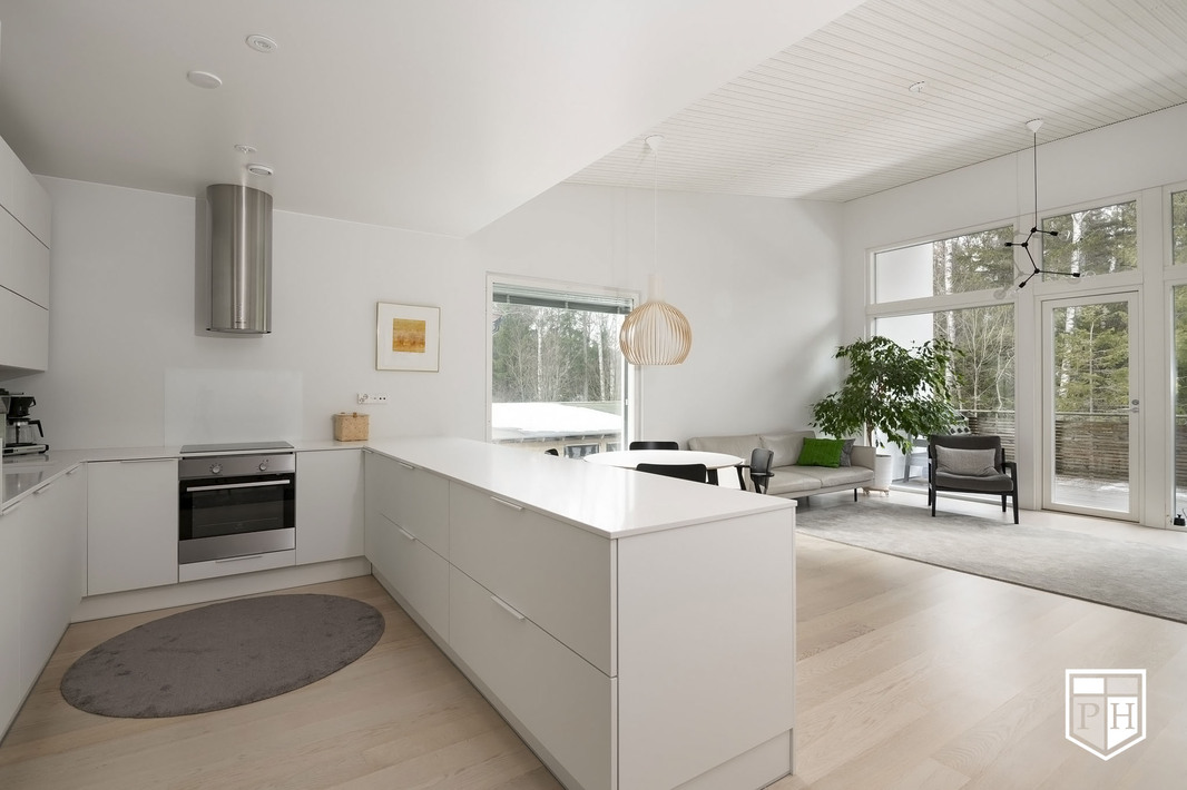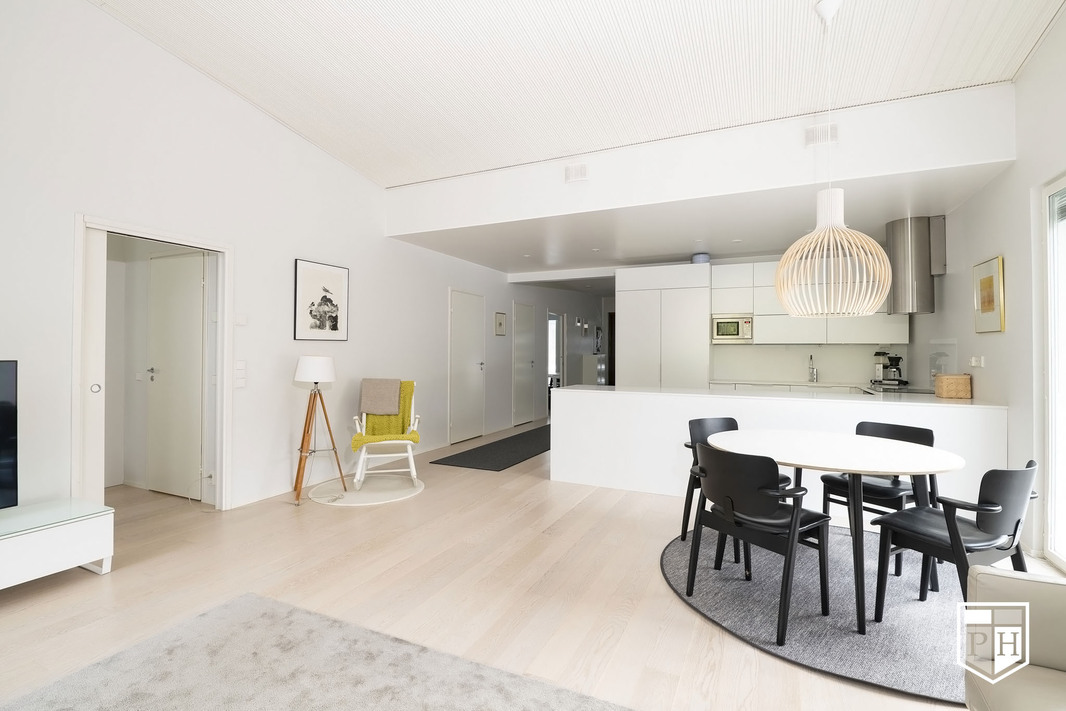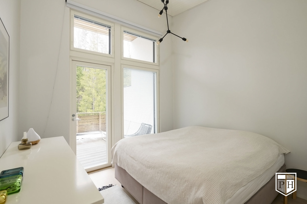 Moderni, vaaleasävyinen keittiö ja olohuone yhtenäistä, avaraa ja valoisaa tilaa, josta käynti isolle terassiparvekkeelle - täydellinen paikka nauttia luonnon rauhasta ja grilliherkuista. Tilan tuntua lisää viisto, korotettu sisäkatto. Makuuhuoneita on kolme. Master bedroomista on suora yhteys tyylikkäälle saunaosastolle. Huoneen moottorikäyttöinen pimennysverho lisää mukavuutta.