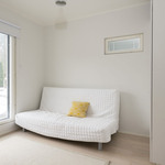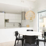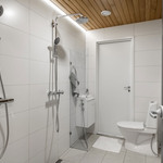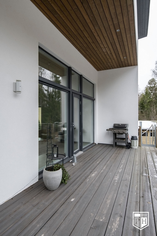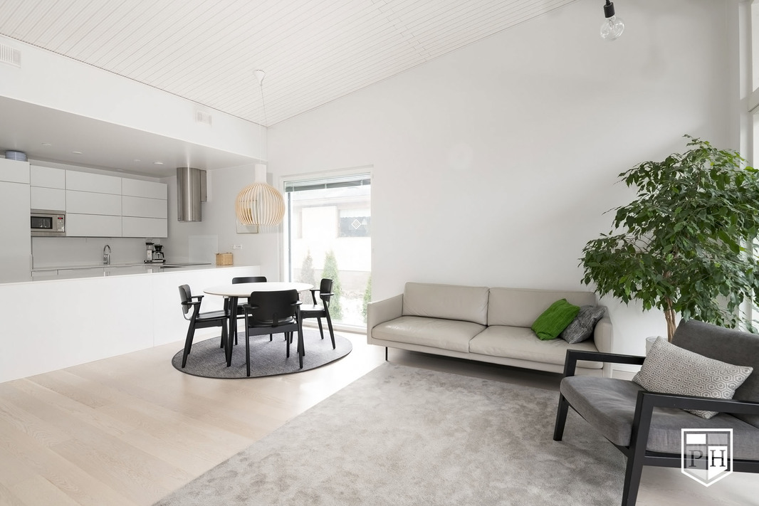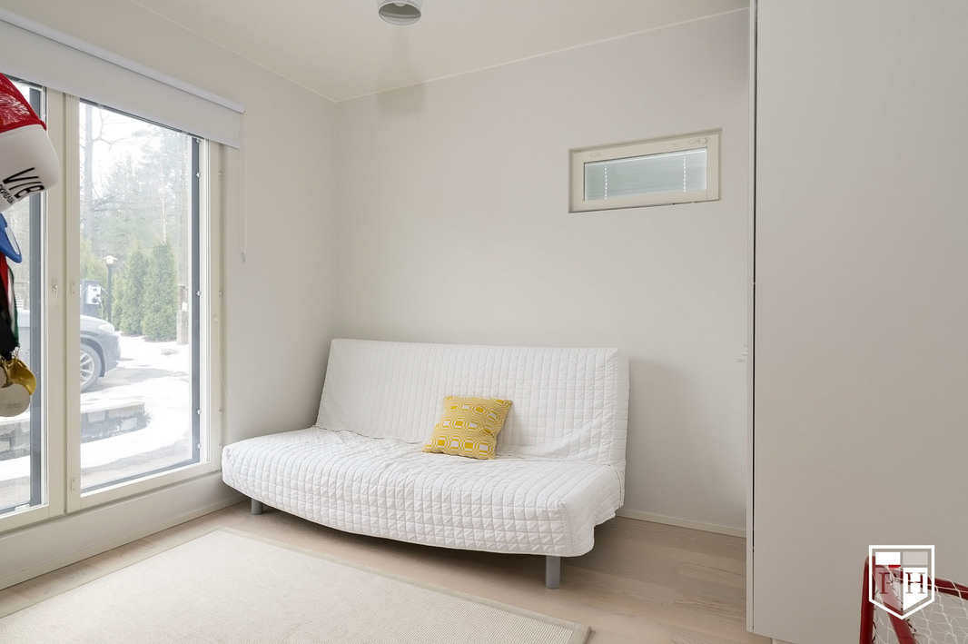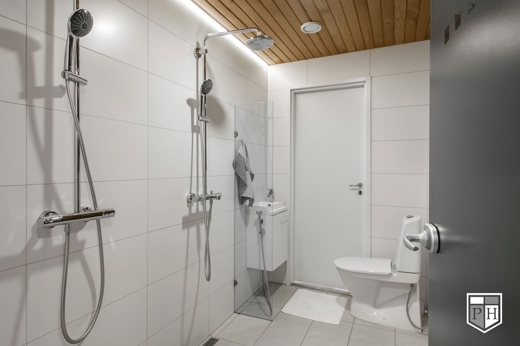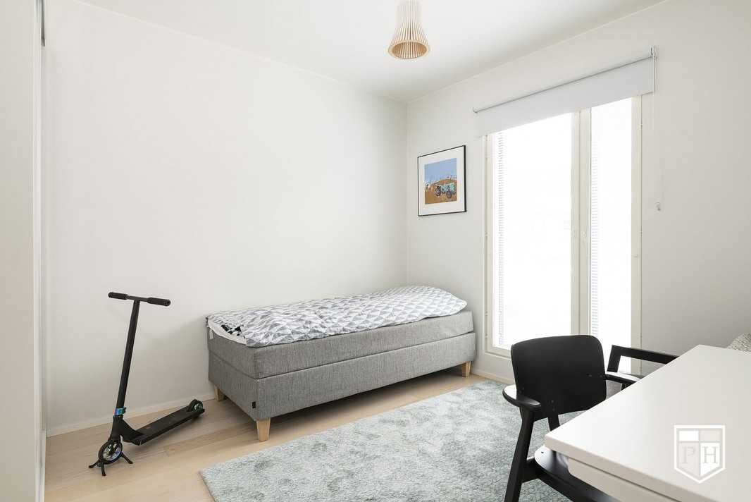 Moderni, vaaleasävyinen keittiö ja olohuone yhtenäistä, avaraa ja valoisaa tilaa, josta käynti isolle terassiparvekkeelle - täydellinen paikka nauttia luonnon rauhasta ja grilliherkuista. Tilan tuntua lisää viisto, korotettu sisäkatto. Makuuhuoneita on kolme. Master bedroomista on suora yhteys tyylikkäälle saunaosastolle. Huoneen moottorikäyttöinen pimennysverho lisää mukavuutta.