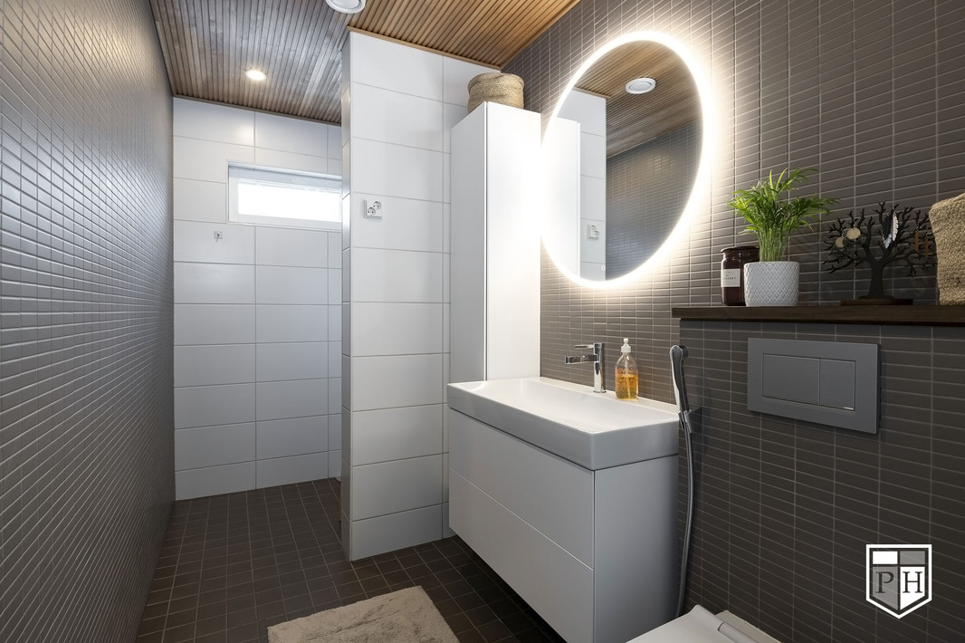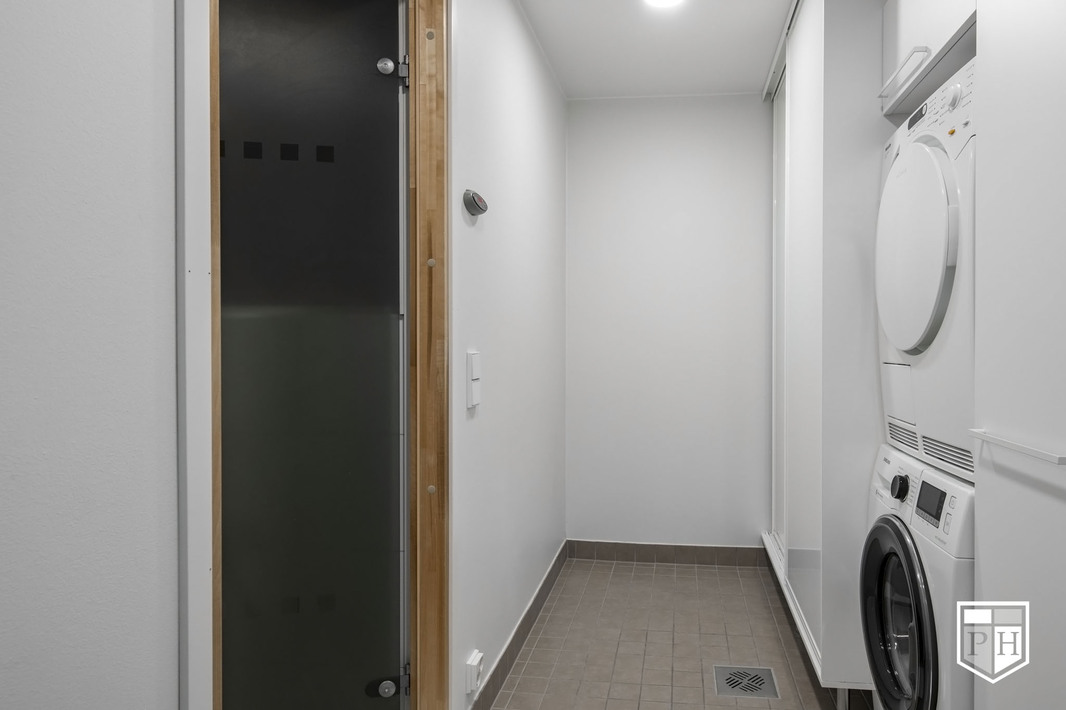 Arkea sujuvoittaa tilava kodinhoitohuone sekä vaatehuone. Saunaosaston lisäksi asunnossa on myös erillinen, ikkunallinen kylpyhuone.