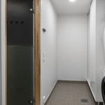 Kylpyhuoneen kuvaus Kylpyhuone: Seinät ja lattia laatoitettu. Suihku, seinä-wc, käsisuihku, pesuallas, allaslaatikosto, valopeili, ikkuna. Pesuhuone: Seinät ja lattia laatoitettu. Kaksi suihkua, wc-istuin, käsisuihku, pesuallas, allaskaapisto.