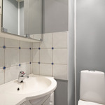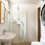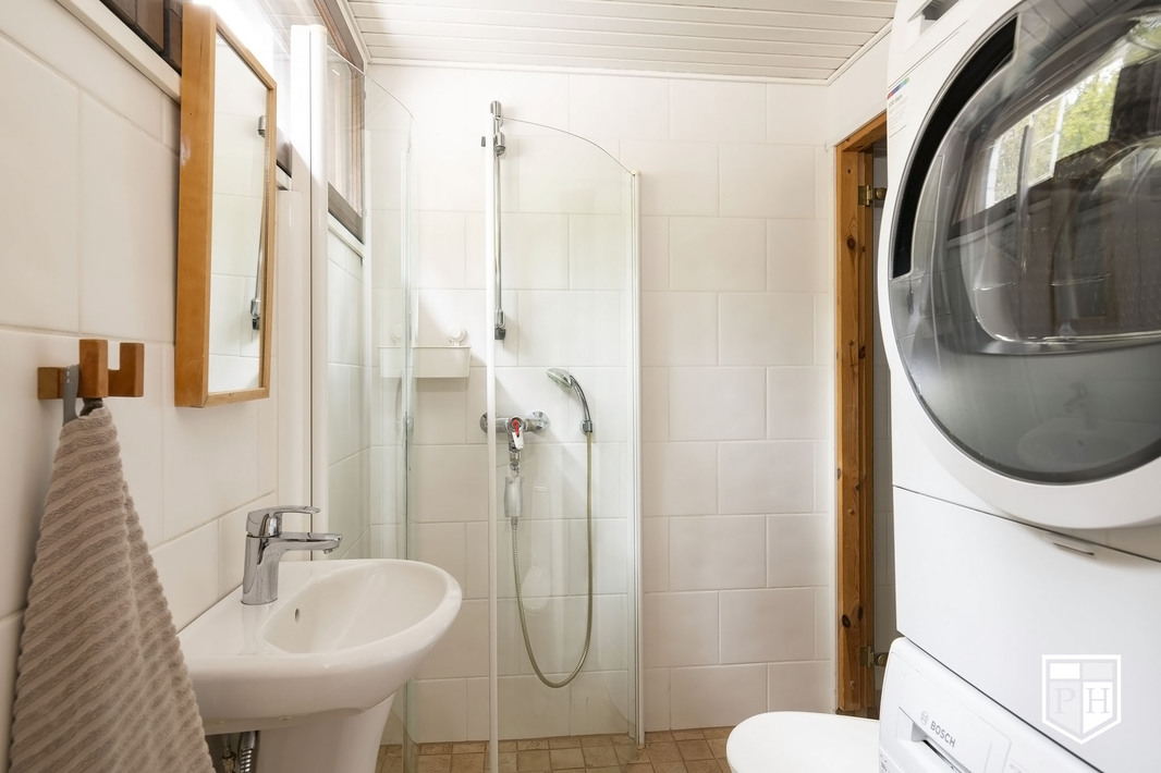 Kylpyhuoneen kuvaus Suihku, suihkukaappi, peili, pesukoneliitäntä, avohyllyt, wc-istuin. Seinät ja lattia laattaa, lattialämmitys. Suihkun alueella ja laattasaumoissa Vevex pinnoitus. Silikonisaumat uusittu.