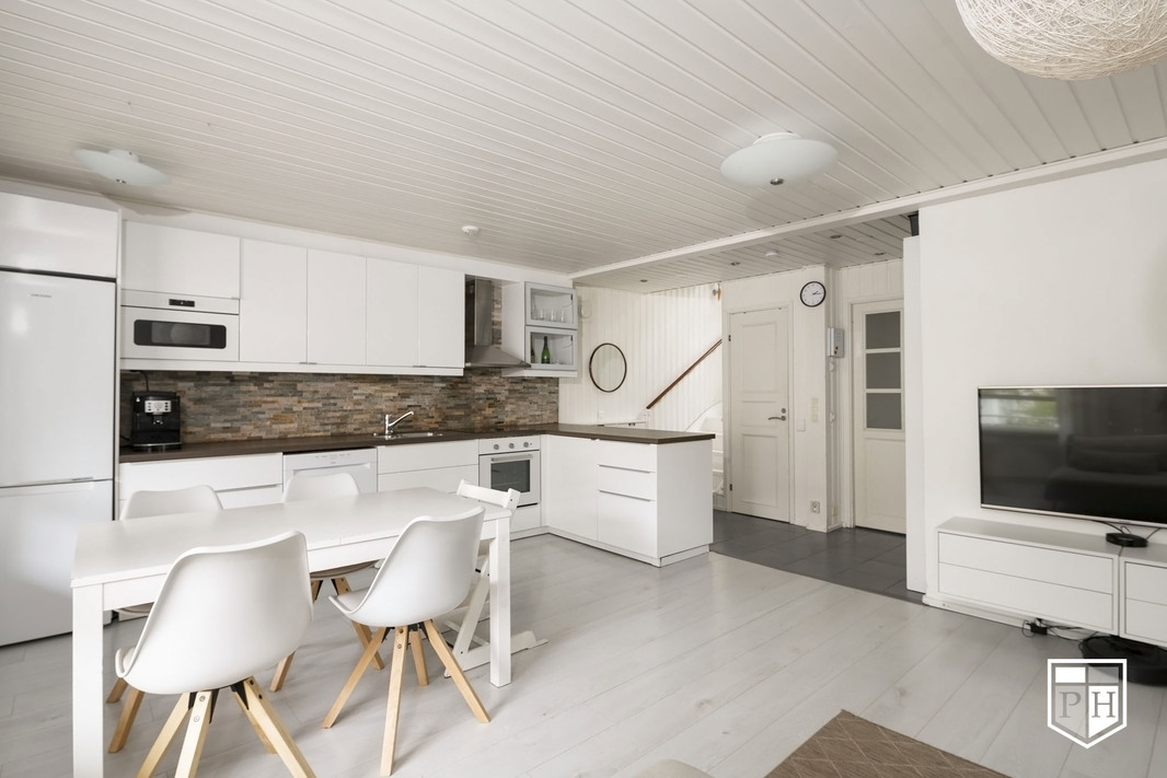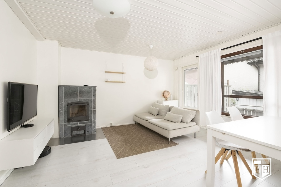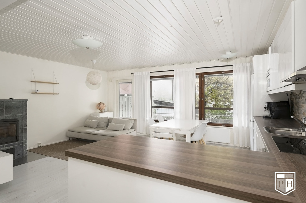 Sisääntulokerroksessa on kaunis, yhtenäistä tilaa oleva avokeittiö, ruokailutila ja olohuone. Olohuoneen varaava takka luo tunnelmaa pimeneviin syysiltoihin. Takka ja ilmalämpöpumppu yhdessä tuovat merkittävän säästön lämmityskuluihin. Olohuoneesta on käynti terassiparvekkeelle. Sisääntulokerroksessa on myös kompakti saunaosasto.