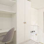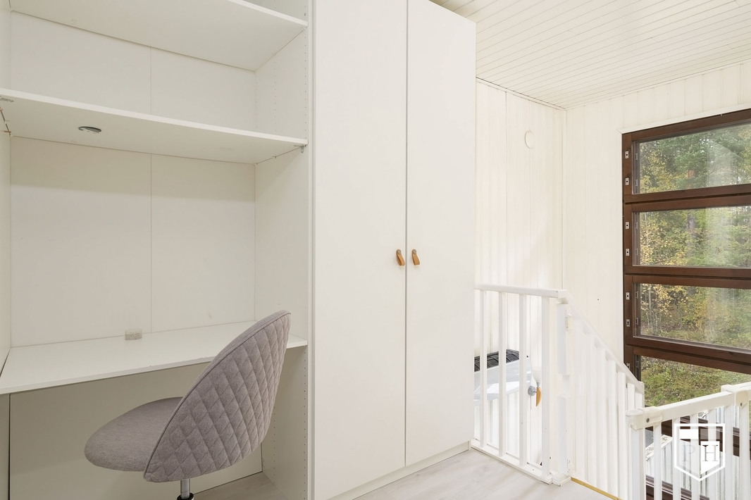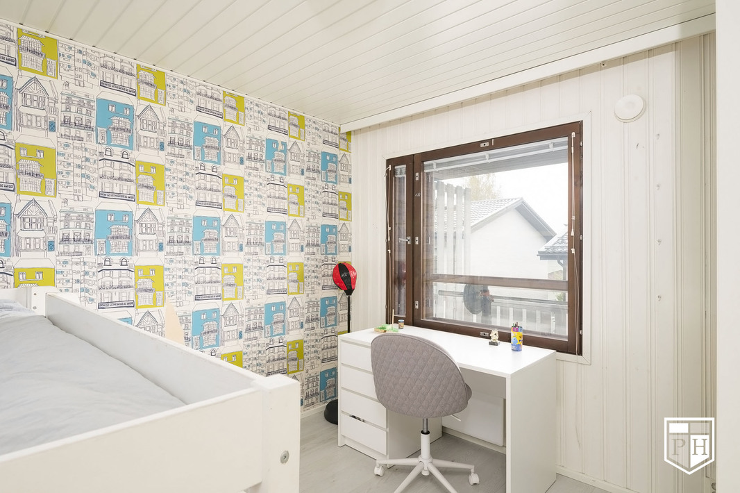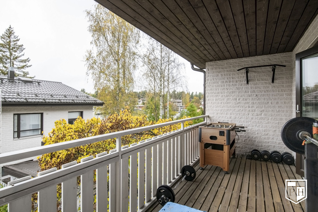 Yläkerrassa on 3 makuuhuonetta. Yläkerran lattiat ovat vinyylilankkua. Aulatila soveltuu hyvin etätyöpisteeksi. Yläkerrassa on myös erillinen wc ja viihtyisä länsiparveke ilta-aurinkoon.