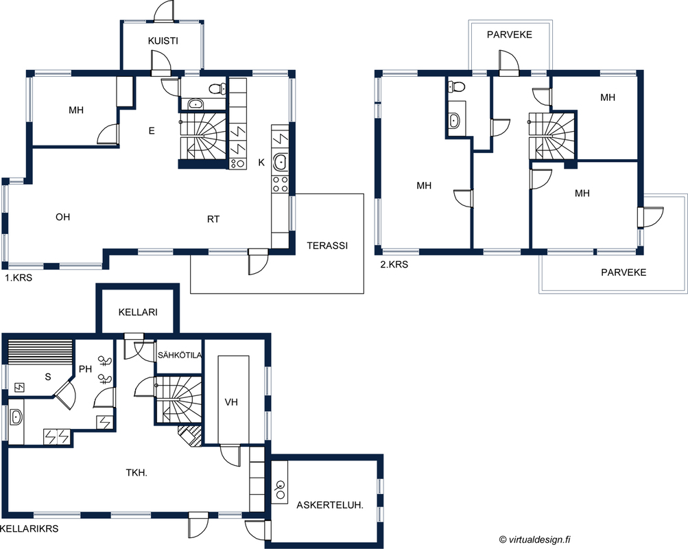 Avaraa tilaa kolmessa kerroksessa. Kellarikerroksessa iso oleskeluhuone, joka tytön unelma vaatehuone, saunatilat, osittain kylmäkellari, tekninen tila. Omalla sisäänkäynnillä harraste / varastohuone.