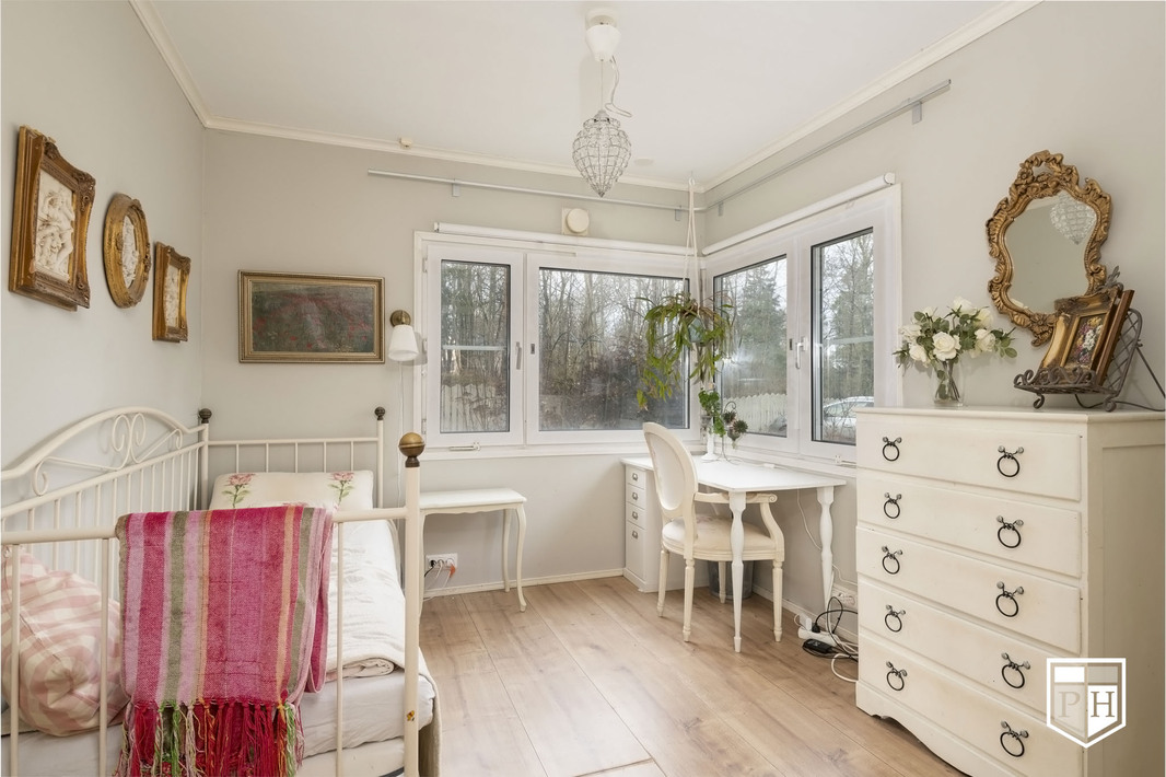 2. kerroksessa kaksi isoa makuuhuonetta ja erillinen wc. Alun perin ollut neljä makuuhuonetta. Terassit 1. ja 2. kerroksessa.