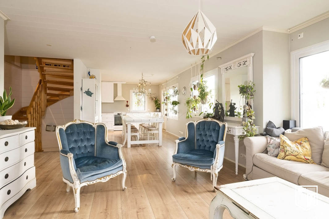1. kerros on sisääntulokerros. Romanttisen kuistin kautta avaraan olohuoneeseen, joka jatkuu yhtenäisenä avoimena tilana ruokailutilasta avokeittiöön. Pienenä lisänä ja yksityiskohtana keittiön vanha, mutta toimiva puuhella. Paljon ikkunapintaa ja valoa!