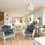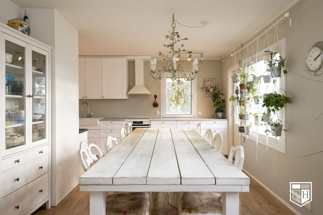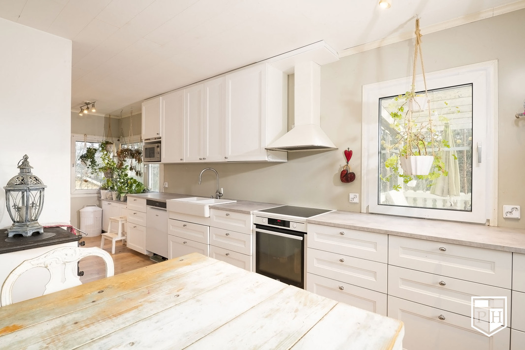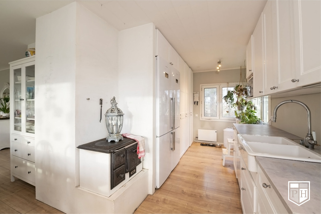 | Keittiön varustelu | Induktioliesi, liesituuletin, kaksi jääkaappipakastinta, astianpesukone, puuhella. Lattia laminaattia. |