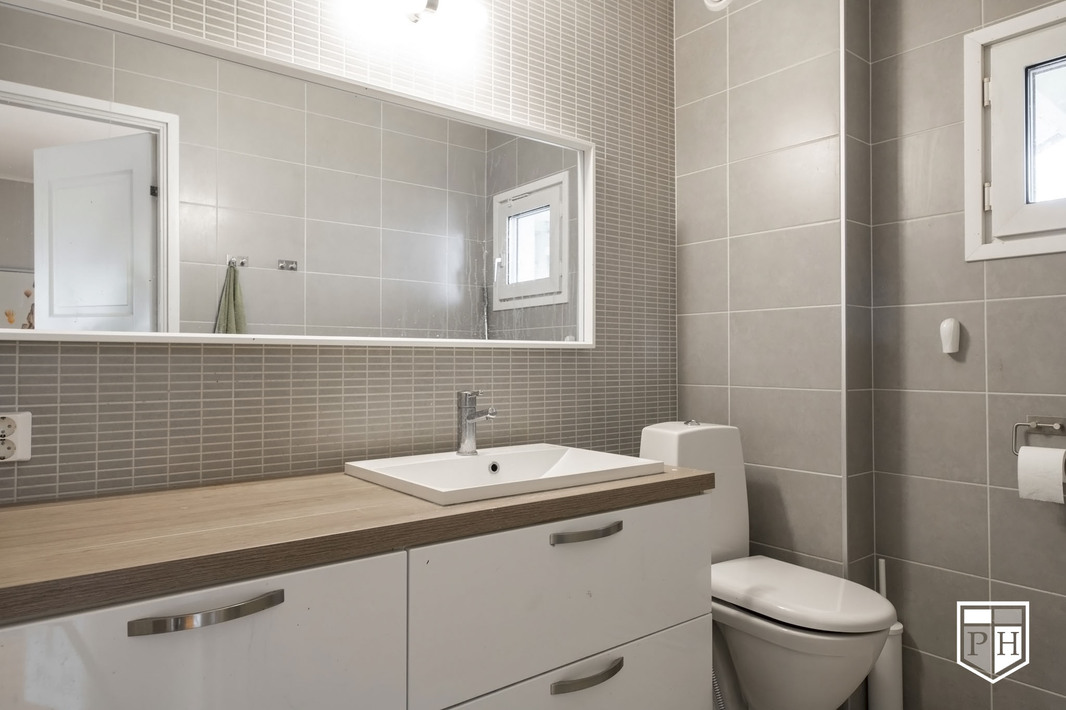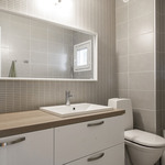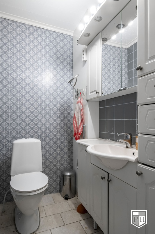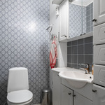 | Kylpyhuoneen kuvaus | Seinät ja lattia laatoitettu, lattialämmitys. Kaksi suihkua, wc-istuin, pesuallas. |