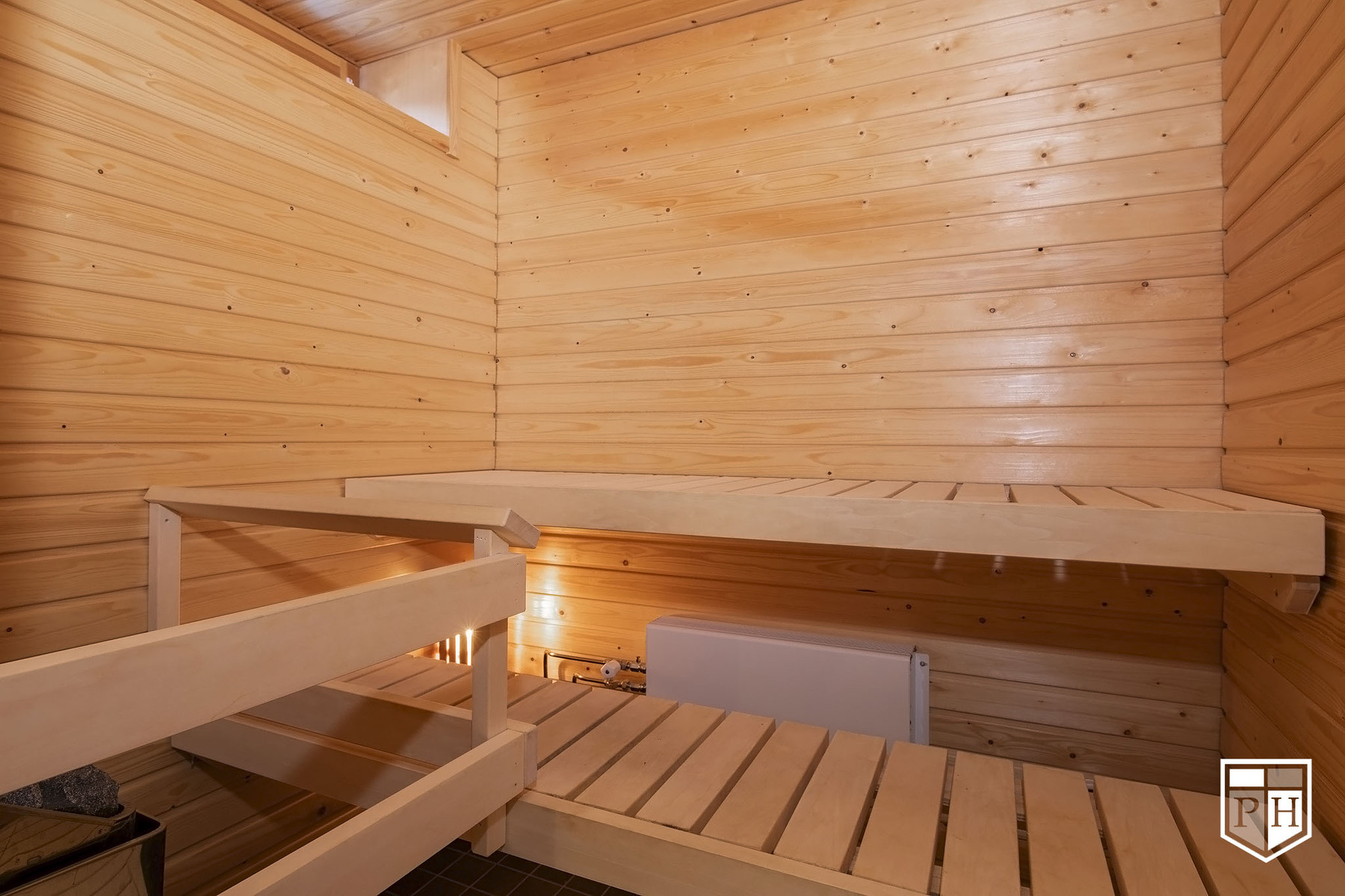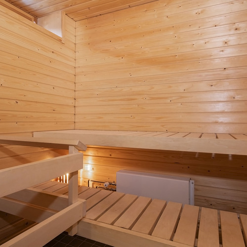 Saunassa ikkuna. Sähkökiuas.