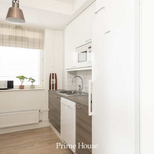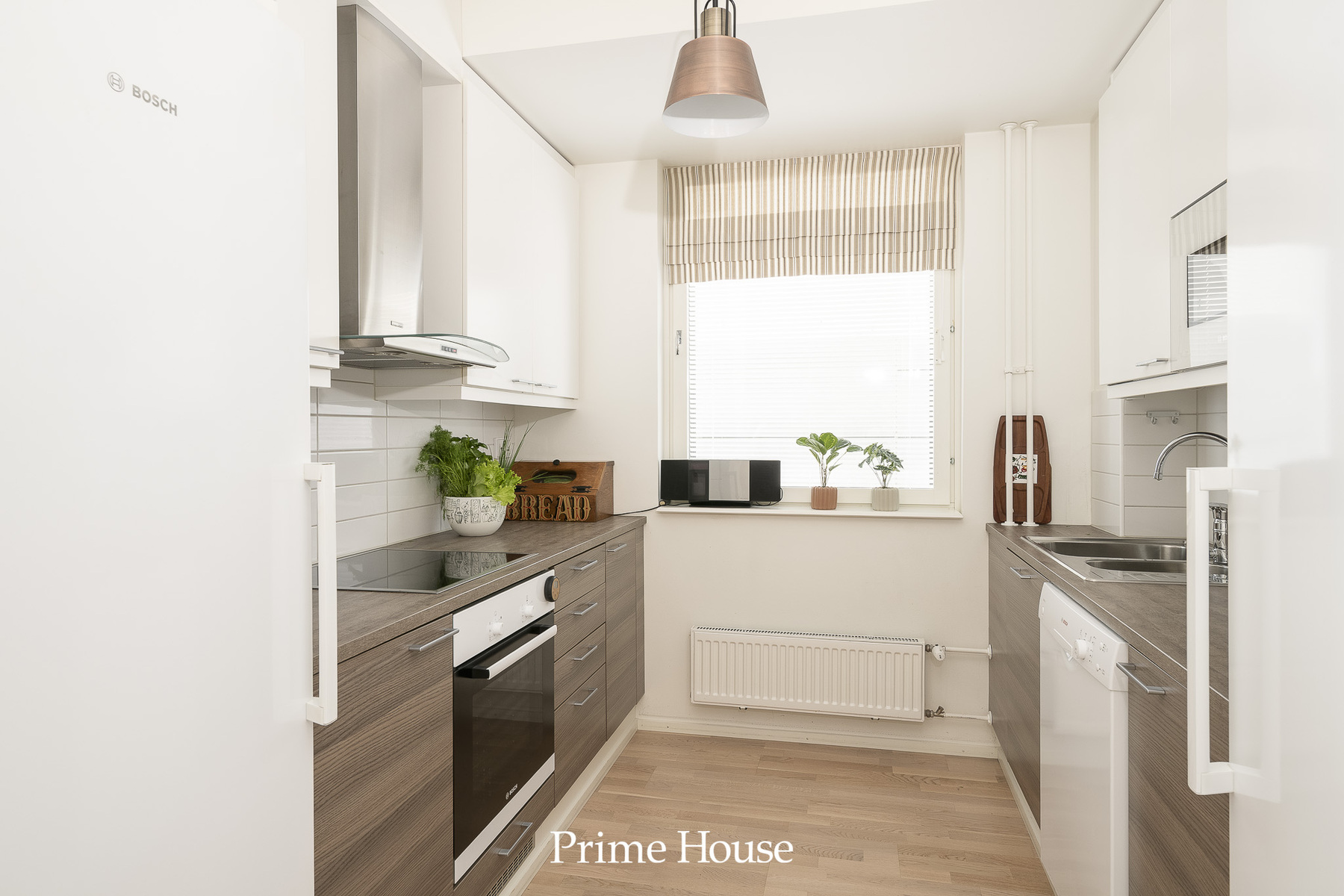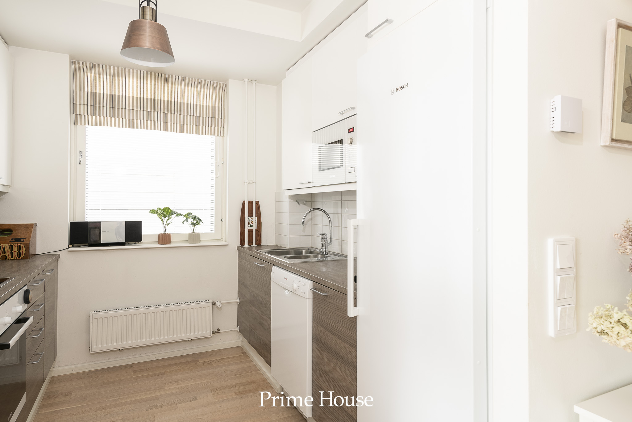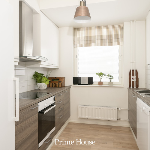 kokonaisuus. Ilmettä antavat valkoiset yläkaapit ja ruskeat alakaapit. Varusteina on Bosch - merkkiset jääkaappi, pakastinkaappi, keraaminen liesitaso, kiertoilmauuni, integroitu mikroaaltouuni, astianpesukone ja Swegon - merkkinen rosterinen liesituuletin.