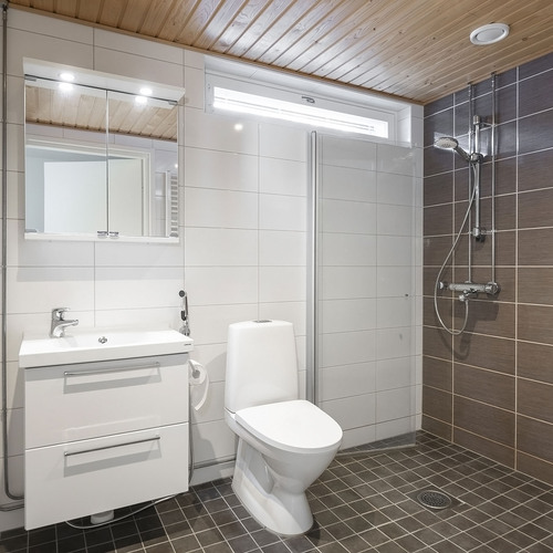 Lattia ja seinät laatoitettu.